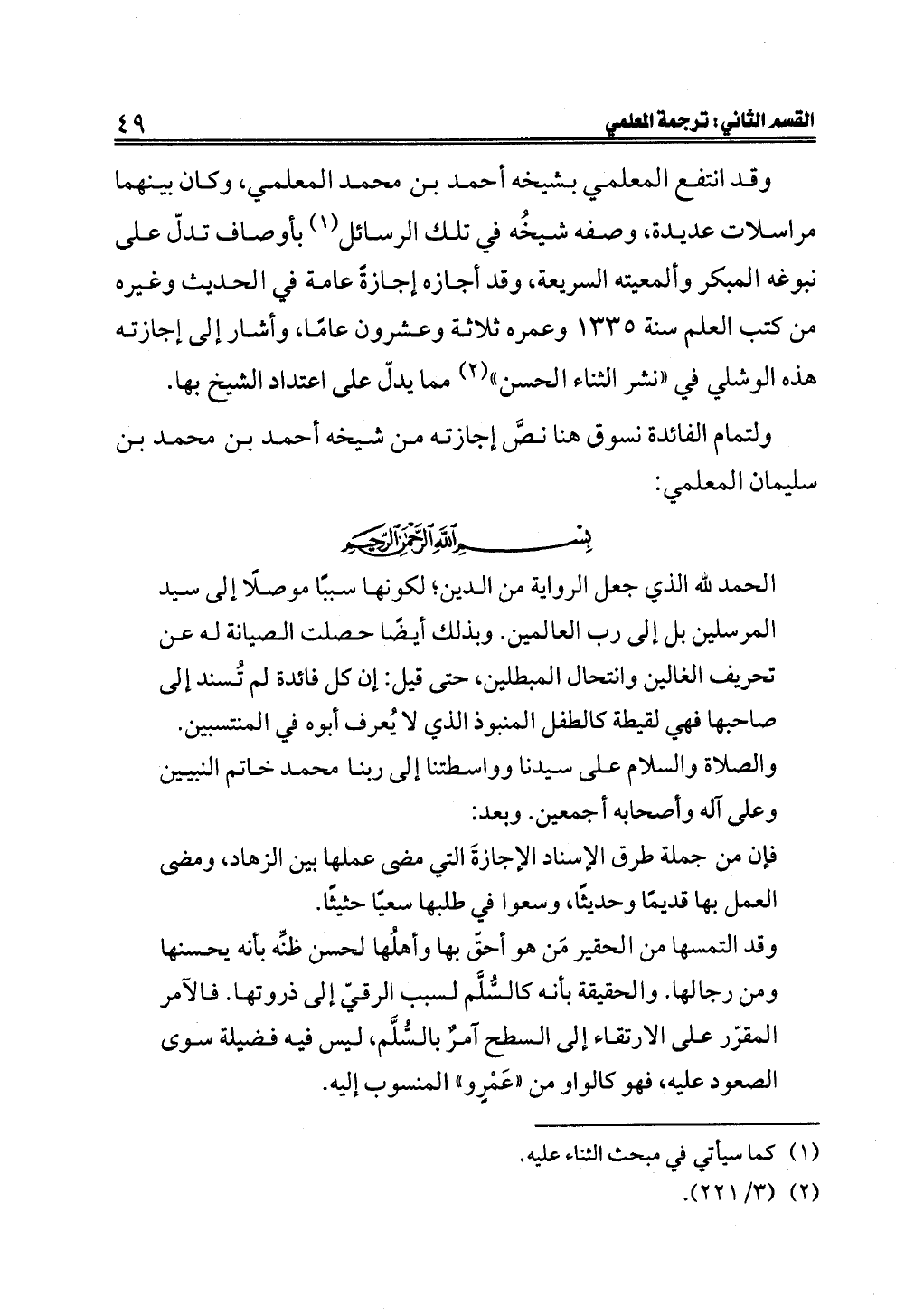 ولتمام الفائدة نسوق هنا نصَّ إجازته من شيخه أحمد بن محمد بن سليمان المعلمي: