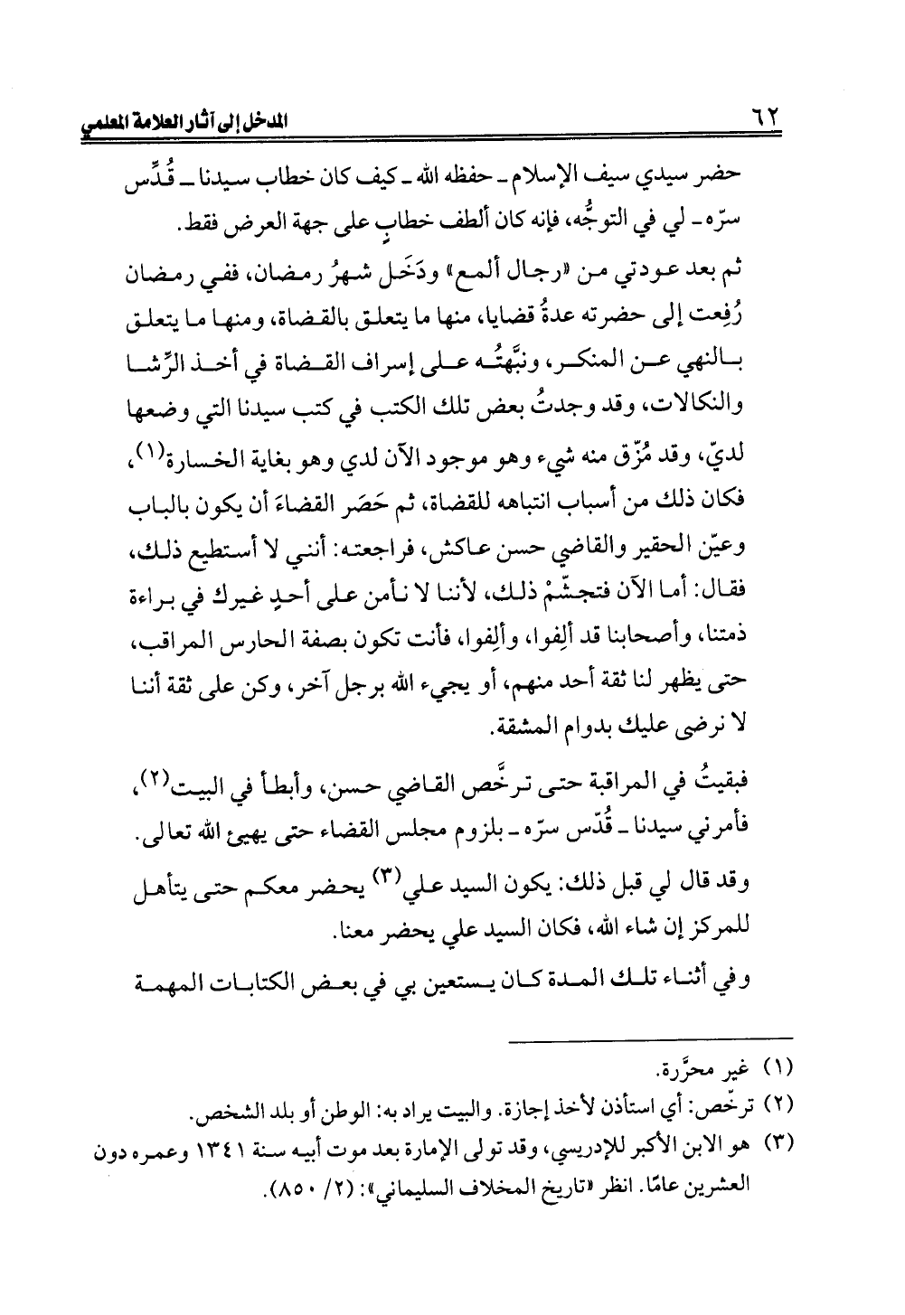 ثم بعد عودتي من "رجال ألمع" ودَخَل شهرُ رمضان، ففي رمضان رُفِعت إلى حضرته عدةُ قضايا، منها ما يتعلق بالقضاة، ومنها ما يتعلق بالنهي عن المنكر، ونبَّهتُه على إسراف القضاة في أخذ الرِّشا والنكالات، وقد وجدتُ بعض تلك الكتب في كتب سيدنا التي وضعها لديّ، وقد مُزّق منه شيء وهو موجود الآن لدي وهو بغاية الخسارة (¬١)، فكان ذلك من أسباب انتباهه للقضاة، ثم حَصَر القضاءَ أن يكون بالباب وعيّن الحقير والقاضي حسن عاكش، فراجعته: أنني لا أستطيع ذلك، فقال: أما الآن فتجشّمْ ذلك، لأننا لا نأمن على أحدٍ غيرك في براءة ذمتنا، وأصحابنا قد ألِفوا، وألِفوا، فأنت تكون بصفة الحارس المراقب، حتى يظهر لنا ثقة أحد منهم، أو يجيء الله برجل آخر، وكن على ثقة أننا لا نرضى عليك بدوام المشقة.