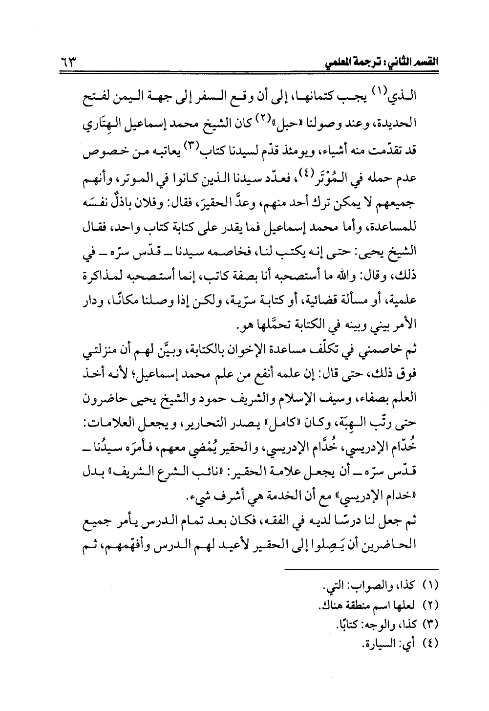 الذي (¬١) يجب كتمانها، إلى أن وقع السفر إلى جهة اليمن لفتح الحديدة، وعند وصولنا "حبل" (¬٢) كان الشيخ محمد إسماعيل الهِتَاري قد تقدّمت منه أشياء، ويومئذ قدّم لسيدنا كتاب (¬٣) يعاتبه من خصوص عدم حمله في المُوْتَر (¬٤)، فعدّد سيدنا الذين كانوا في الموتر، وأنهم جميعهم لا يمكن ترك أحد منهم، وعدَّ الحقيرَ، فقال: وفلان باذلٌ نفسَه للمساعدة، وأما محمد إسماعيل فما يقدر على كتابة كتاب واحد، فقال الشيخ يحيى: حتى إنه يكتب لنا، فخاصمه سيدنا ــ قدّس سرّه ــ في ذلك، وقال: والله ما أستصحبه أنا بصفة كاتب، إنما أستصحبه لمذاكرة علمية، أو مسألة قضائية، أو كتابة سرّية، ولكن إذا وصلنا مكانًا، ودار الأمر بيني وبينه في الكتابة تحمَّلها هو.
