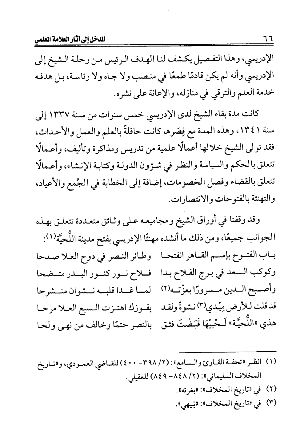 الإدريسي، وهذا التفصيل يكشف لنا الهدف الرئيس من رحلة الشيخ إلى الإدريسي وأنه لم يكن قادمًا طمعًا في منصب ولا جاه ولا رئاسة، بل هدفه خدمة العلم والترقي في منازله، والإعانة على نشره.