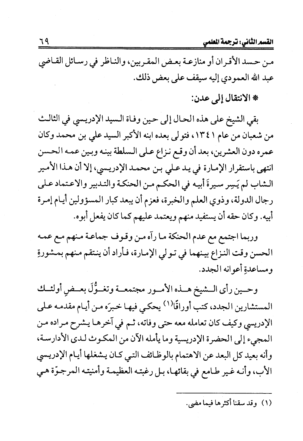 وحين رأى الشيخ هذه الأمور مجتمعة وتغوُّلَ بعضِ أولئك المستشارين الجدد، كتب أوراقًا (¬١) يحكي فيها خبرَه من أيام مقدمه على الإدريسي وكيف كان تعامله معه حتى وفاته، ثم في آخرها يشرح مراده من المجيء إلى الحضرة الإدريسية وما يأمله الآن من المكوث لدى الأدارسة، وأنه بعيد كل البعد عن الاهتمام بالوظائف التي كان يشغلها أيام الإدريسي الأب، وأنه غير طامع في بقائها، بل رغبته العظيمة وأمنيته المرجوّة هي
