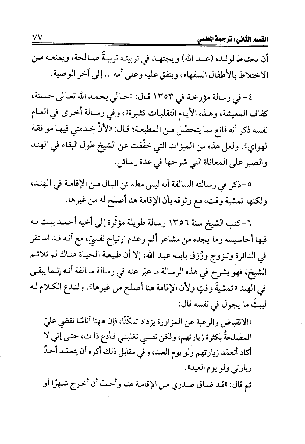٦ - كتب الشيخ سنة ١٣٥٦ رسالة طويلة مؤثّرة إلى أخيه أحمد يبث له فيها أحاسيسه وما يجده من مشاعر ألم وعدم ارتياح نفسيّ، مع أنه قد استقر في الدائرة وتزوج ورُزق بابنه عبد الله، إلا أن طبيعة الحياة هناك لم تلائم الشيخ، فهو يشرح في هذه الرسالة ما عبّر عنه في رسالة سالفة أنه إنما يبقى في الهند "تمشيةَ وقتٍ ولأن الإقامة هنا أصلح من غيرها". ولندع الكلام له ليبثّ ما يجول في نفسه قال:
