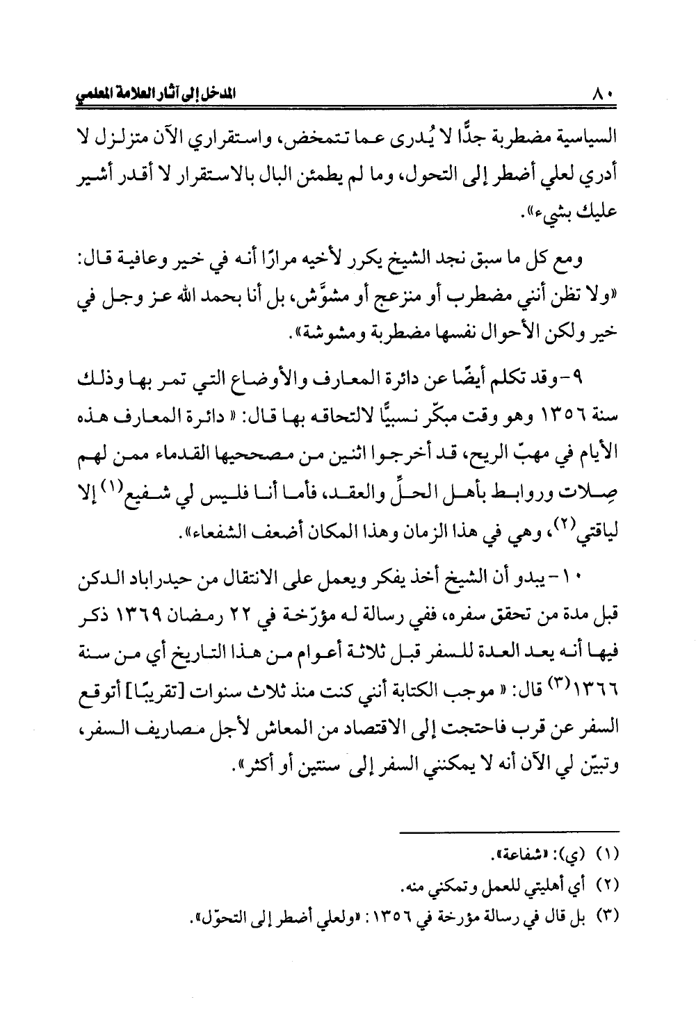 ١٠ - يبدو أن الشيخ أخذ يفكر ويعمل على الانتقال من حيدراباد الدكن قبل مدة من تحقق سفره، ففي رسالة له مؤرّخة في ٢٢ رمضان ١٣٦٩ ذكر فيها أنه يعد العدة للسفر قبل ثلاثة أعوام من هذا التاريخ أي من سنة ١٣٦٦ (¬٣) قال: " موجب الكتابة أنني كنت منذ ثلاث سنوات [تقريبًا] أتوقع السفر عن قرب فاحتجت إلى الاقتصاد من المعاش لأجل مصاريف السفر، وتبيّن لي الآن أنه لا يمكنني السفر إلى سنتين أو أكثر".