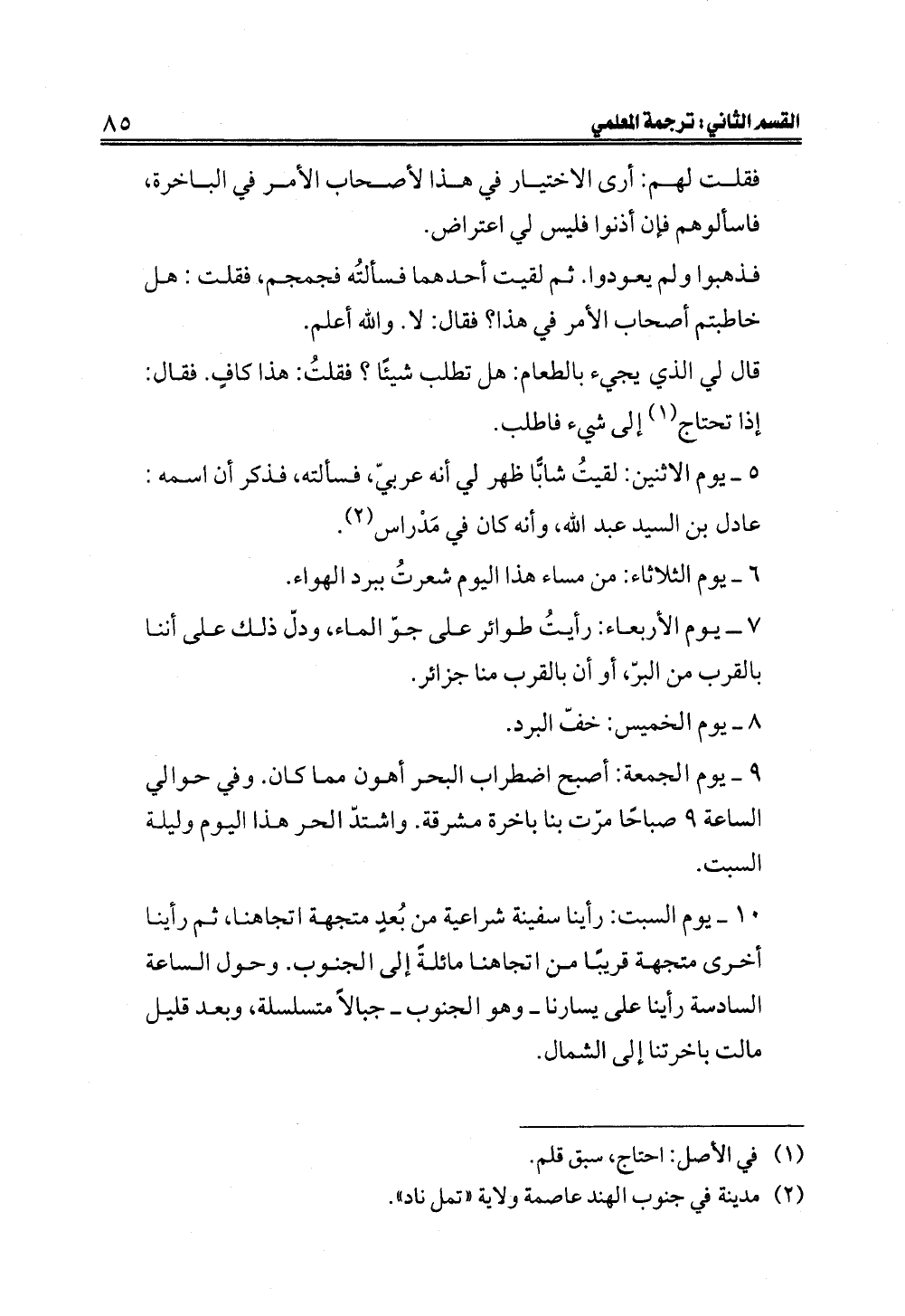 ٥ ــ يوم الاثنين: لقيتُ شابًّا ظهر لي أنه عربيّ، فسألته، فذكر أن اسمه: عادل بن السيد عبد الله، وأنه كان في مَدْراس (¬٢).