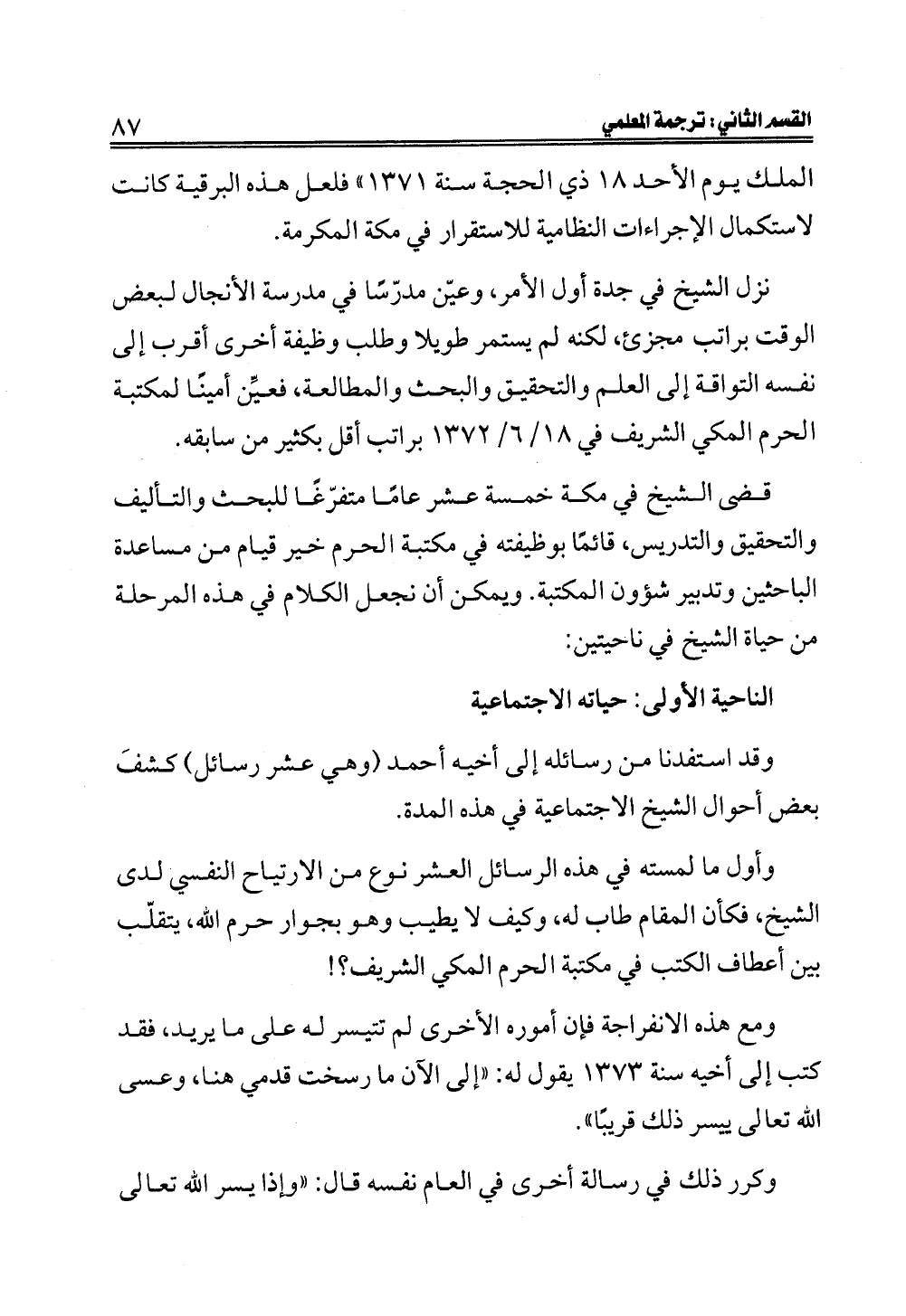 وأول ما لمسته في هذه الرسائل العشر نوع من الارتياح النفسي لدى الشيخ، فكأن المقام طاب له، وكيف لا يطيب وهو بجوار حرم الله، يتقلّب بين أعطاف الكتب في مكتبة الحرم المكي الشريف؟!