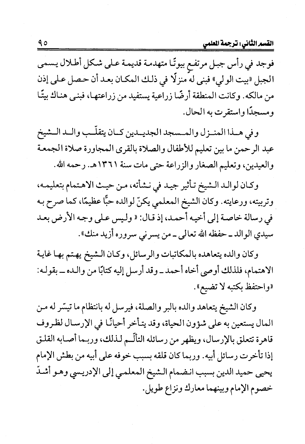 وكان الشيخ يتعاهد والده بالبر والصلة، فيرسل له بانتظام ما تيسّر له من المال يستعين به على شؤون الحياة، وقد يتأخر أحيانًا في الإرسال لظروف قاهرة تتعلق بالإرسال، ويظهر من رسائله التألّم لذلك، وربما أصابه القلق إذا تأخرت رسائل أبيه. وربما كان قلقه بسبب خوفه على أبيه من بطش الإمام يحيى حميد الدين بسبب انضمام الشيخ المعلمي إلى الإدريسي وهو أشدّ خصوم الإمام وبينهما معارك ونزاع طويل.