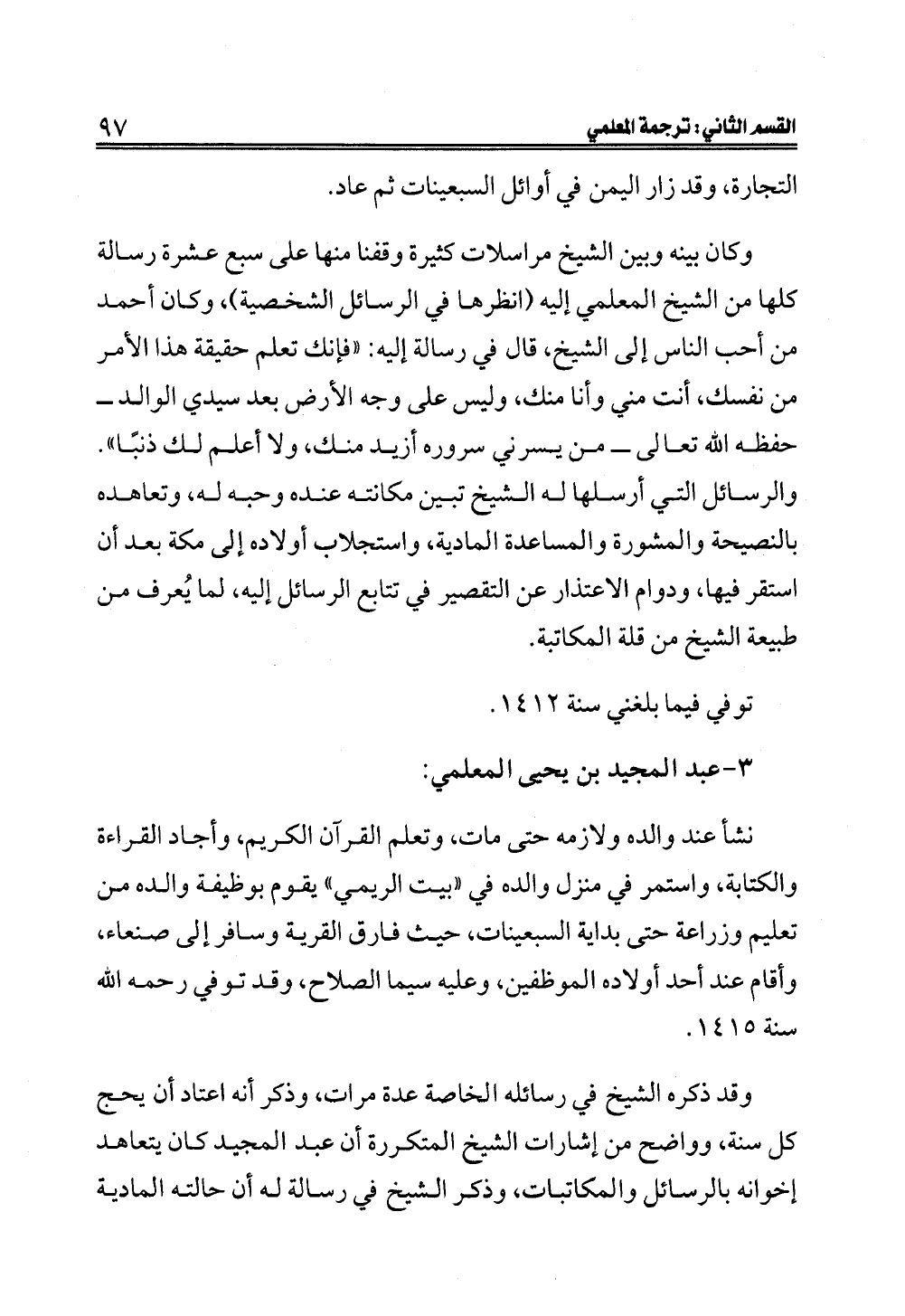 وقد ذكره الشيخ في رسائله الخاصة عدة مرات، وذكر أنه اعتاد أن يحج كل سنة، وواضح من إشارات الشيخ المتكررة أن عبد المجيد كان يتعاهد إخوانه بالرسائل والمكاتبات، وذكر الشيخ في رسالة له أن حالته المادية