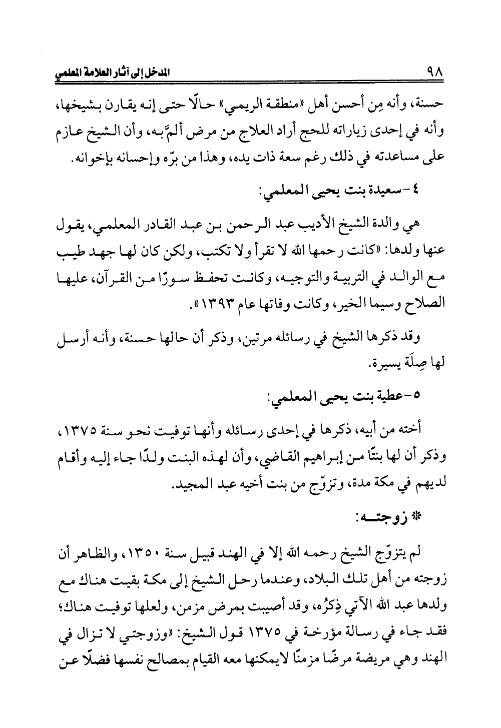 لم يتزوّج الشيخ رحمه الله إلا في الهند قبيل سنة ١٣٥٠، والظاهر أن زوجته من أهل تلك البلاد، وعندما رحل الشيخ إلى مكة بقيت هناك مع ولدها عبد الله الآتي ذِكرُه، وقد أصيبت بمرض مزمن، ولعلها توفيت هناك؛ فقد جاء في رسالة مؤرخة في ١٣٧٥ قول الشيخ: "وزوجتي لا تزال في الهند وهي مريضة مرضًا مزمنًا لايمكنها معه القيام بمصالح نفسها فضلًا عن
