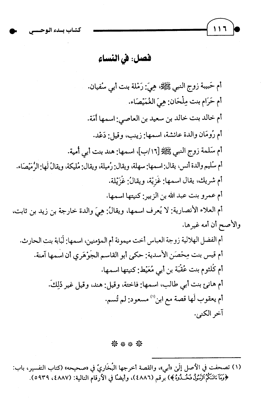 أم العلاء الأنصارية: لا يُعرف اسمها، ويقالُ: هِيَ والدة خارجة بن زيد بن ثابت، والأصح أن أمه غيرها.