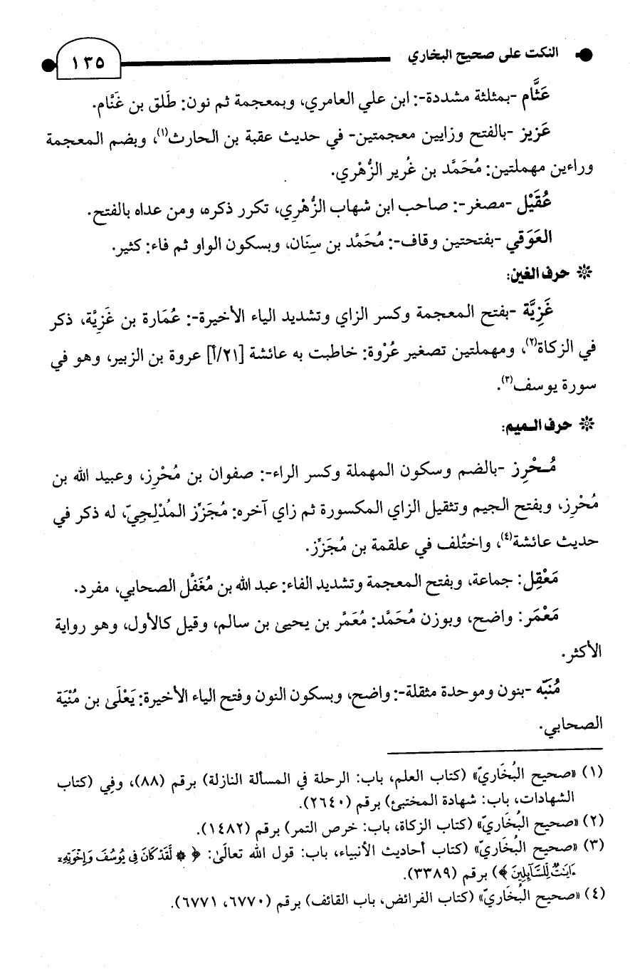 مُحْرِز -بالضم وسكون المهملة وكسر الراء-: صفوان بن مُحْرِز، وعبيد الله بن مُحْرِز، وبفتح الجيم وتثقيل الزاي المكسورة ثم زاي آخره: مُجَزِّز المُدْلِجِيّ، له ذكر في حديث عائشة (¬4)، واختلف في علقمة بن مُجَزِّز.