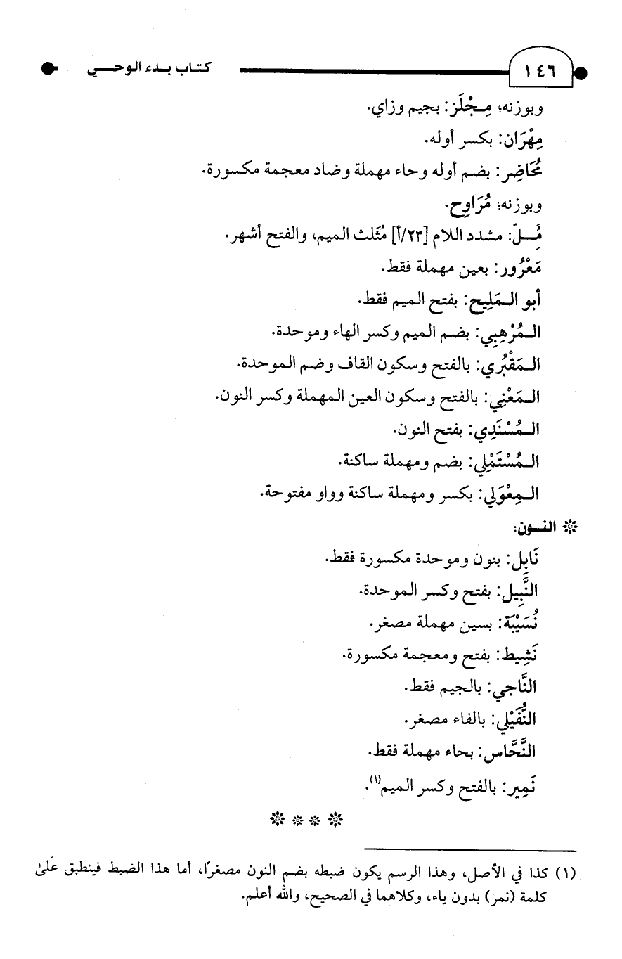 (¬1) كذا في الأصل، وهذا الرسم يكون ضبطه بضم النون مصغرًا، أما هذا الضبط فينطبق عَلى كلمة (نمر) بدون ياء، وكلاهما في الصحيح، والله أعلم.