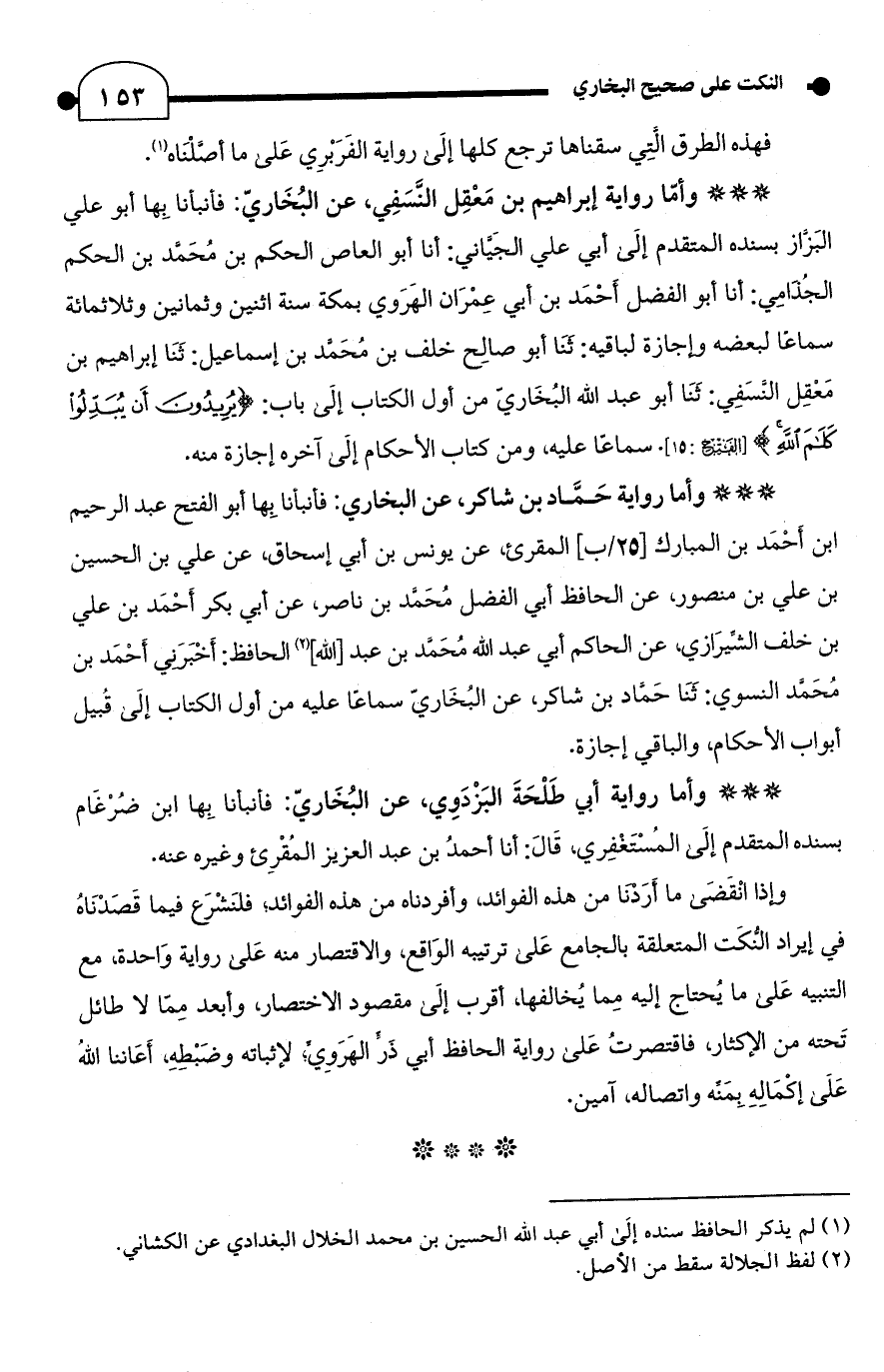 * * * وأمَّا رواية إبراهيم بن مَعْقِل النَّسَفِي، عن البُخَاريّ: فأنبأنا بِها أبو علي البَزَّاز بسنده المتقدم إلَى أبي علي الجَيَّاني: أنا أبو العاص الحكم بن مُحَمَّد بن الحكم الجُذَامِي: أنا أبو الفضل أَحْمَد بن أبي عِمْرَان الهَرَوي بمكة سنة اثنين وثمانين وثلاثمائة سماعًا لبعضه وإجازة لباقيه: ثَنَا أبو صالِح خلف بن مُحَمَّد بن إسماعيل: ثَنَا إبراهيم بن مَعْقِل النَّسَفِي: ثَنَا أبو عبد الله البُخَاريّ من أول الكتاب إلَى باب: {يُرِيدُونَ أَنْ يُبَدِّلُوا كَلَامَ اللَّهِ} [الفتح: 15]. سماعًا عليه، ومن كتاب الأحكام إلَى آخره إجازة منه.