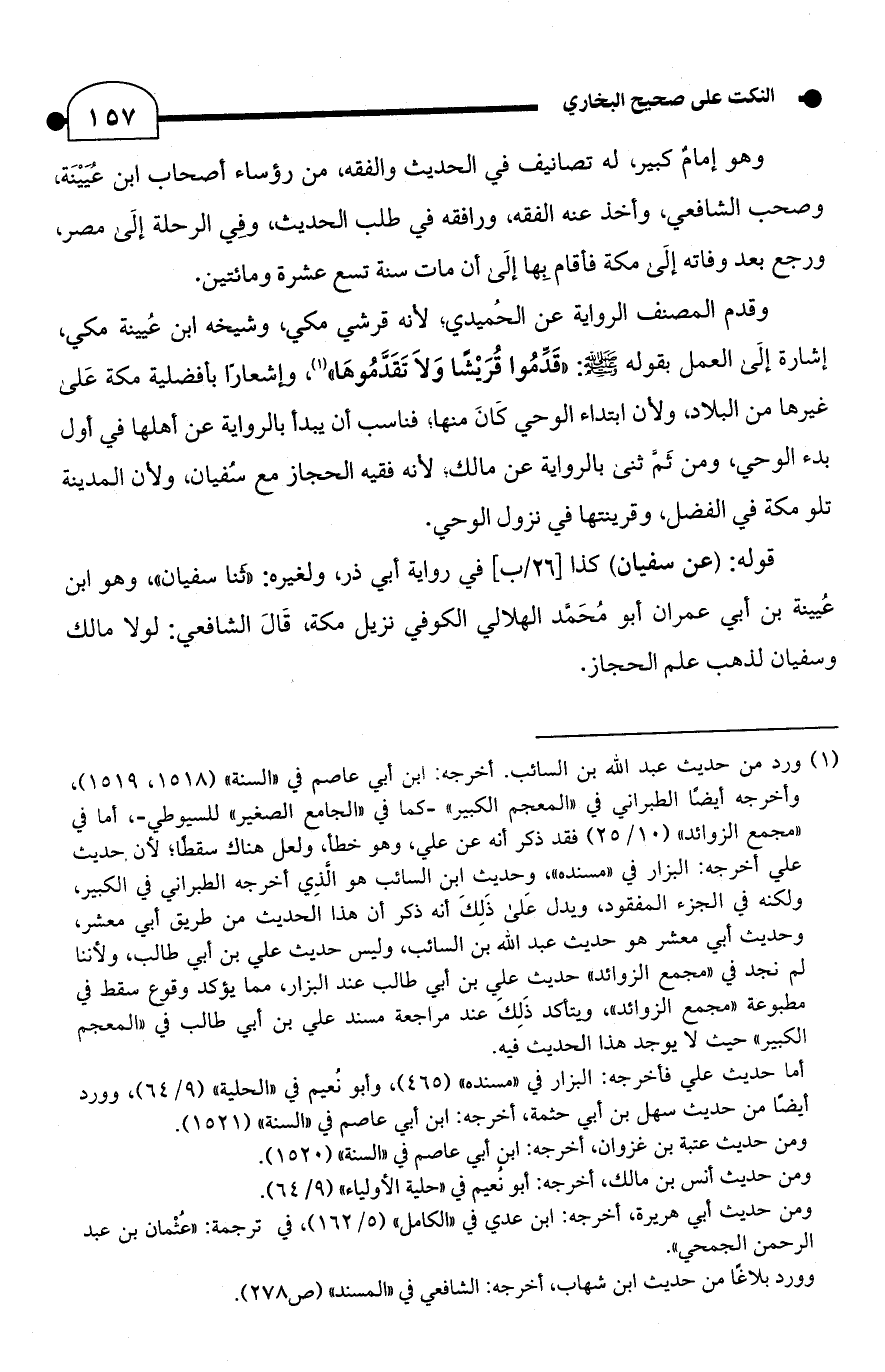 وقدم المصنف الرواية عن الحُميدي؛ لأنه قرشي مكي، وشيخه ابن عُيينة مكي، إشارة إلَى العمل بقوله - صلى الله عليه وسلم -: "قَدِّمُوا قُرَيْشًا وَلاَ تَقَدَّمُوهَا" (¬1)، وإشعارًا بأفضلية مكة عَلى غيرها من البلاد، ولأن ابتداء الوحي كَانَ منها؛ فناسب أن يبدأ بالرواية عن أهلها في أول بدء الوحي، ومن ثَمَّ ثنى بالرواية عن مالك؛ لأنه فقيه الحجاز مع سُفيان، ولأن المدينة تلو مكة في الفضل، وقرينتها في نزول الوحي.