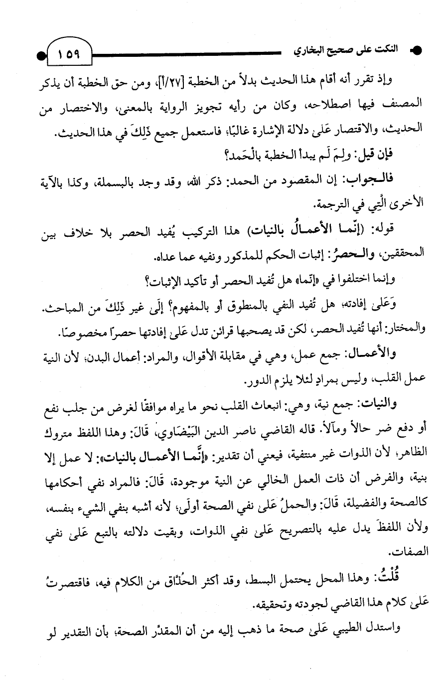 قوله: (إنّما الأعمالُ بالنيات) هذا التركيب يُفيد الحصر بلا خلاف بين المحققين، والحصرُ: إثبات الحكم للمذكور ونفيه عما عداه.