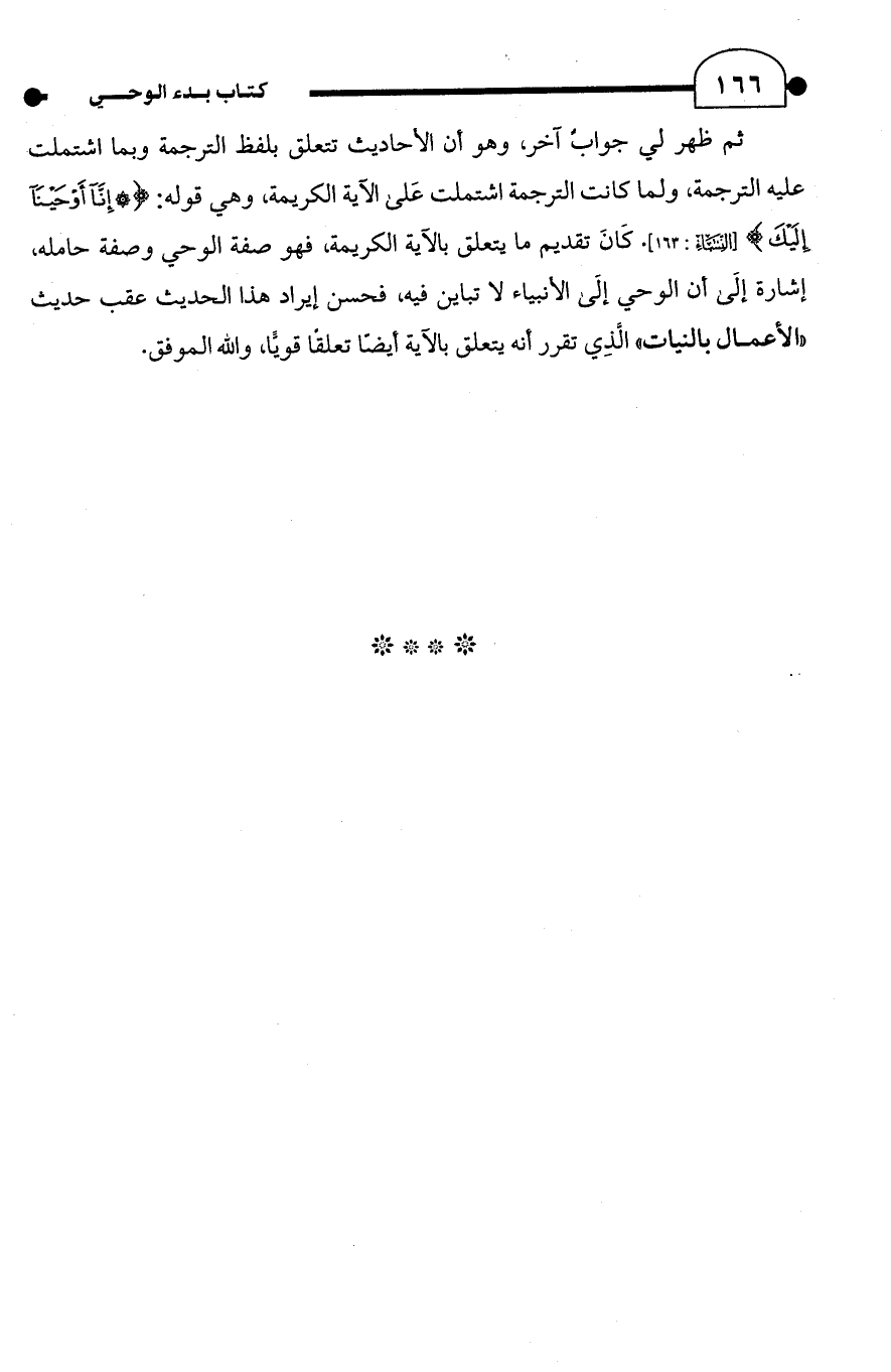 ثم ظهر لي جوابٌ آخر، وهو أن الأحاديث تتعلق بلفظ الترجمة وبما اشتملت عليه الترجمة، ولما كانت الترجمة اشتملت عَلى الآية الكريمة، وهي قوله: {إِنَّا أَوْحَيْنَا إِلَيْكَ} [النساء: 163]. كَانَ تقديم ما يتعلق بالآية الكريمة، فهو صفة الوحي وصفة حامله، إشارة إلَى أن الوحي إلَى الأنبياء لا تباين فيه، فحسن إيراد هذا الحديث عقب حديث "الأعمال بالنيات" الَّذِي تقرر أنه يتعلق بالآية أيضًا تعلقا قويًّا، والله الموفق.