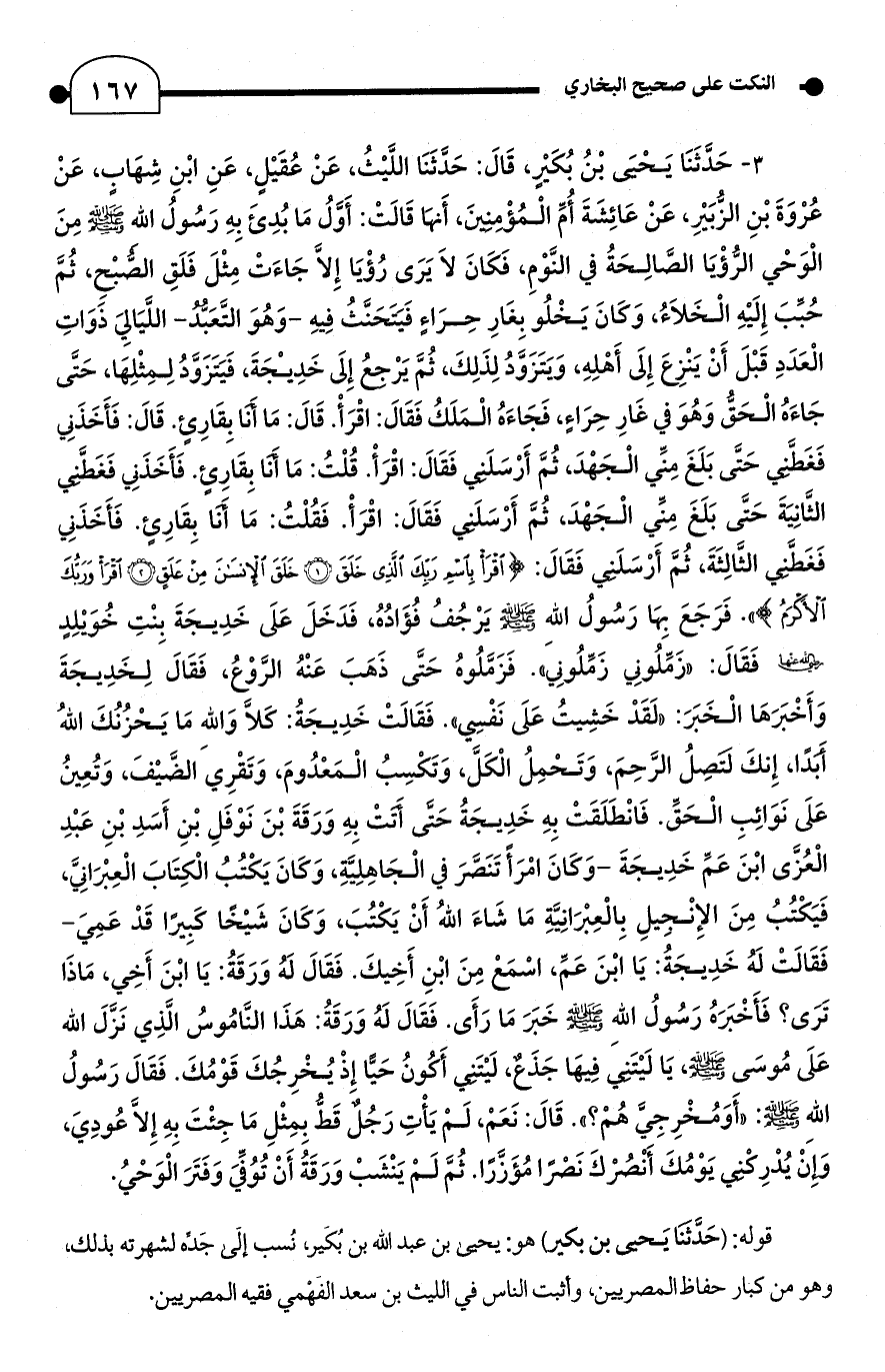 3 - حَدَّثَنَا يَحْيىَ بْنُ بُكَيْرٍ، قَالَ: حَدَّثَنَا اللَّيْثُ، عَنْ عُقَيْلٍ، عَنِ ابْنِ شِهَابٍ، عَنْ عُرْوَةَ بْنِ الزُّبَيْرِ، عَنْ عَائِشَةَ أُمِّ الْمُؤْمنينَ، أَنهَا قَالَتْ: أَوَّلُ مَا بُدِئَ بِهِ رَسُولُ الله - صلى الله عليه وسلم - مِنَ الْوَحْي الرُّؤْيَا الصَّالِحَةُ في النَّوْمِ، فَكَانَ لا يَرَى رُؤْيَا إِلَّا جَاءَتْ مِثْلَ فَلَقِ الصُّبْحِ، ثُمَّ حُبِّبَ إِلَيْهِ الْخَلَاءُ، وَكَانَ يَخْلُو بِغَارِ حِرَاءٍ فَيَتَحَنَّثُ فِيهِ -وَهُوَ التَّعَبُّدُ- اللَّيَالِيَ ذَوَاتِ الْعَدَدِ قَبْلَ أَنْ يَنْزِعَ إِلَى أَهْلِهِ، وَيَتَزَوَّدُ لِذَلِكَ، ثُمَّ يَرْجعُ إِلَى خَدِيْجَةَ، فَيَتَزَوَّدُ لِمِثْلِهَا، حَتَّى جَاءَهُ الْحَقُّ وَهُوَ في غَارِ حِرَاءٍ، فَجَاءَهُ الْمَلَكُ فَقَالَ: اقْرَأْ. قَالَ: مَا أَنَا بِقَارِئٍ. قَالَ: فَأَخَذَنِي فَغَطَّني حَتَى بَلَغَ مِنِّي الْجَهْدَ، ثُم أَرْسَلَنِي فَقَالَ: اقْرَأْ. قُلْتُ: مَا أَنا بِقَارِئٍ. فَأَخَذَنِي فَغَطَّني الثَّانِيَةَ حَتَى بَلَغَ مِنِّي الْجَهْدَ، ثُمَّ أَرْسَلَنِي فَقَالَ: اقْرَأْ. فَقُلْتُ: مَا أَنا بِقَارِئٍ. فَأَخَذَنِي فَغَطَّنِي الثَّالِثَةَ، ثُمَّ أَرْسَلَنِي فَقَالَ: {اقْرَأْ بِاسْمِ رَبِّكَ الَّذِي خَلَقَ (1) خَلَقَ الْإِنْسَانَ مِنْ عَلَقٍ (2) اقْرَأْ وَرَبُّكَ الْأَكْرَمُ} ". فَرَجَعَ بِهَا رَسُولُ اللهِ - صلى الله عليه وسلم - يَرْجُفُ فُؤَادُهُ، فَدَخَلَ عَلَى خَدِيجَةَ بِنْتِ خُوَيْلِدٍ -رضي الله عنها- فَقَالَ: "زَمِّلُونِي زَمِّلُونِي". فَزَمَّلُوهُ حَتَّى ذَهَبَ عَنْهُ الرَّوْعُ، فَقَالَ لِخَدِيجَةَ وَأَخْبَرَهَا الْخَبَرَ: "لَقَدْ خَشِيتُ عَلَى نَفْسِي". فَقَالَتْ خَدِيجَةُ: كَلَّا وَالله مَا يَحْزُنُكَ اللهُ أَبَدًا، إِنكَ لتَصِلُ الرَّحِمَ، وَتَحْمِلُ الْكَلَّ، وَتَكْسِبُ الْمَعْدُومَ، وَتَقْرِي الضَّيْفَ، وَتُعِينُ عَلَى نَوَائِبِ الْحَقِّ. فَانْطَلَقَتْ بِهِ خَدِيجَةُ حَتى أَتَتْ بِهِ وَرَقَةَ بْنَ نَوْفَلِ بْنِ أَسَدِ بْنِ عَبْدِ الْعُزَّى ابْنَ عَمِّ خَدِيجَةَ -وَكَانَ امْرَأً تَنَصَّرَ في الْجَاهِلِيَّةِ، وَكانَ يَكْتُبُ الْكِتَابَ الْعِبْرَانِيَّ، فَيَكْتُبُ مِنَ الإِنْجِيلِ بِالْعِبْرَانِيَّةِ مَا شَاءَ اللهُ أَنْ يَكْتُبَ، وَكانَ شَيْخًا كبِيرًا قَدْ عَمِيَ- فَقَالَتْ لَهُ خَدِيجَةُ: يَا ابْنَ عَمِّ، اسْمَعْ مِنَ ابْنِ أَخِيكَ. فَقَالَ لَهُ وَرَقَةُ: يَا ابْنَ أَخِي، مَاذَا ترى؟ فَأَخْبَرَهُ رَسُولُ الله - صلى الله عليه وسلم - خَبَرَ مَا رَأَى. فَقَالَ لَهُ وَرَقَةُ: هَذَا النَّامُوسُ الَّذِي نَزَّلَ الله عَلَى مُوسَى - صلى الله عليه وسلم -، يَا لَيْتَنيَ فِيهَا جَذَعٌ، لَيْتَني أَكُونُ حَيًّا إِذْ يُخْرِجُكَ قَوْمُكَ. فَقَالَ رَسُولُ الله - صلى الله عليه وسلم -: "أَوَ مُخْرِجِيَّ هُمْ؟ ". قَالَ: نَعَمْ، لَمْ يَأْتِ رَجُلٌ قَطُّ بِمِثْلِ مَا جِئْتَ بِهِ إِلَّا عُودِيَ، وَإِن يُدْرِكْني يَوْمُكَ أَنْصُرْكَ نَصْرًا مُؤَزَّرًا. ثُمَّ لَمْ يَنْشَبْ وَرَقَةُ أَنْ تُوُفِّيَ وَفَتَرَ الْوَحْيُ.