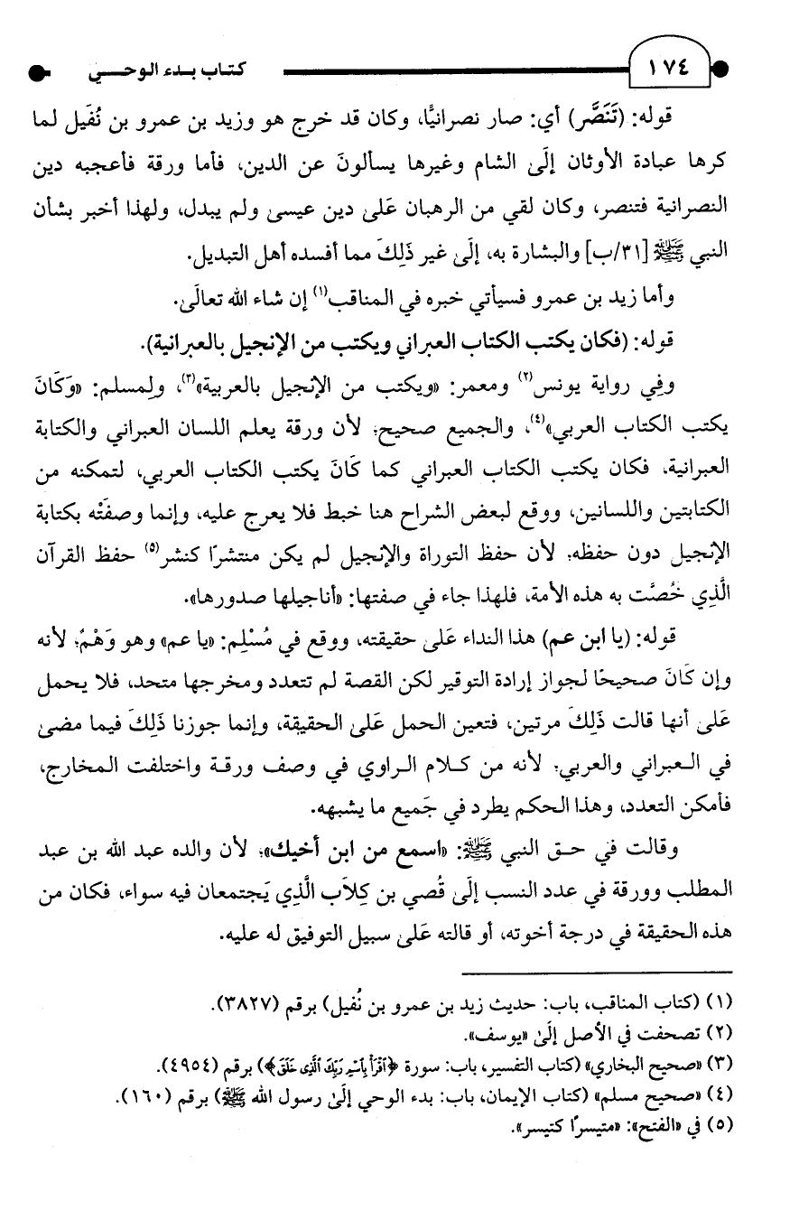 قوله: (تَنَصَّر) أي: صار نصرانيًّا، وكان قد خرج هو وزيد بن عمرو بن نُفَيل لما كرها عبادة الأوثان إلَى الشام وغيرها يسألونَ عن الدين، فأما ورقة فأعجبه دين النصرانية فتنصر، وكان لقي من الرهبان عَلى دين عيسى ولم يبدل، ولهذا أخبر بشأن النبي - صلى الله عليه وسلم -[31/ ب] والبشارة به، إلَى غير ذلِكَ مما أفسده أهل التبديل.
