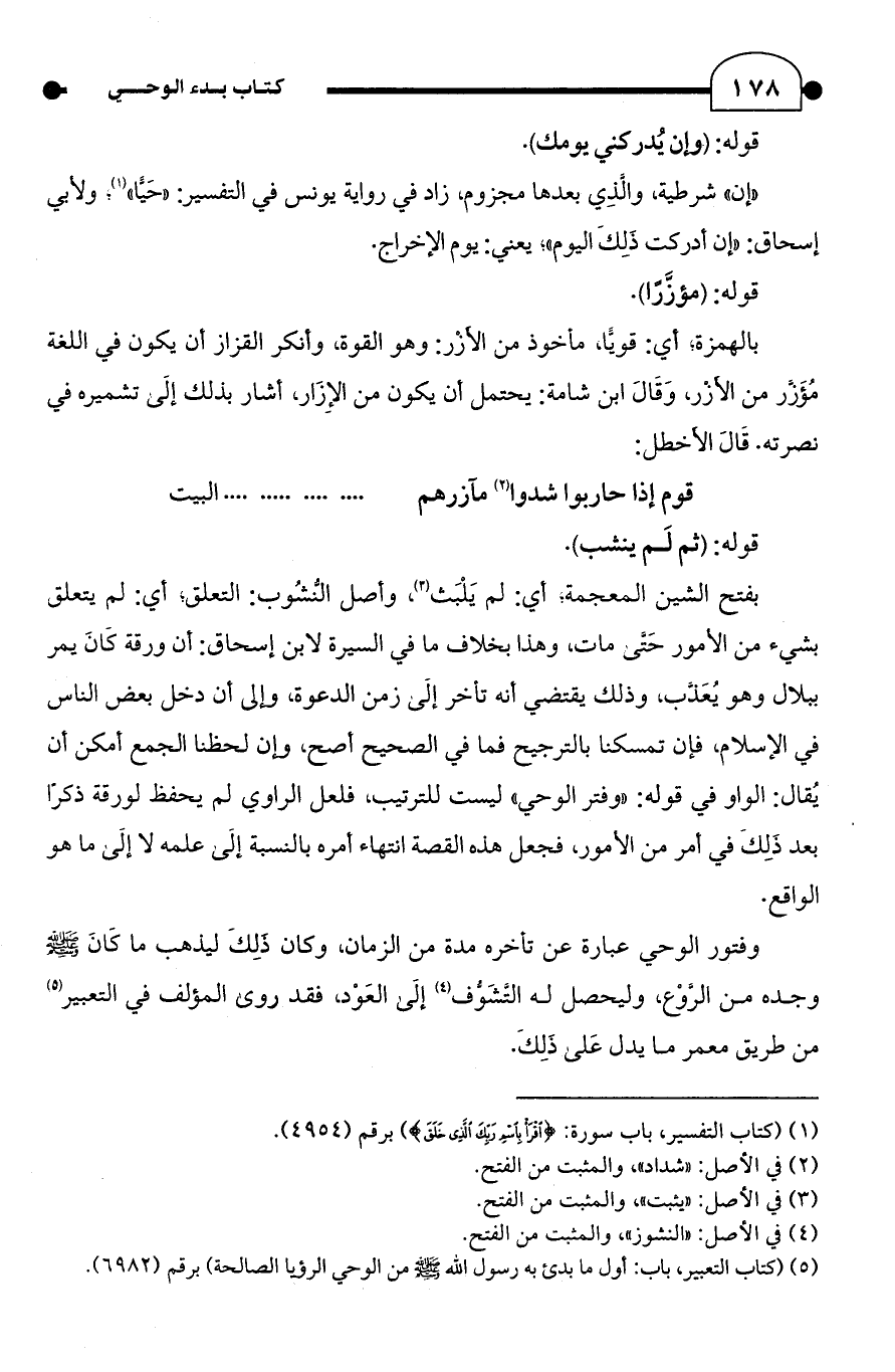 (¬5) (كتاب التعبير، باب: أول ما بدئ به رسول الله - صلى الله عليه وسلم - من الوحي الرؤيا الصالحة) برقم (6982).