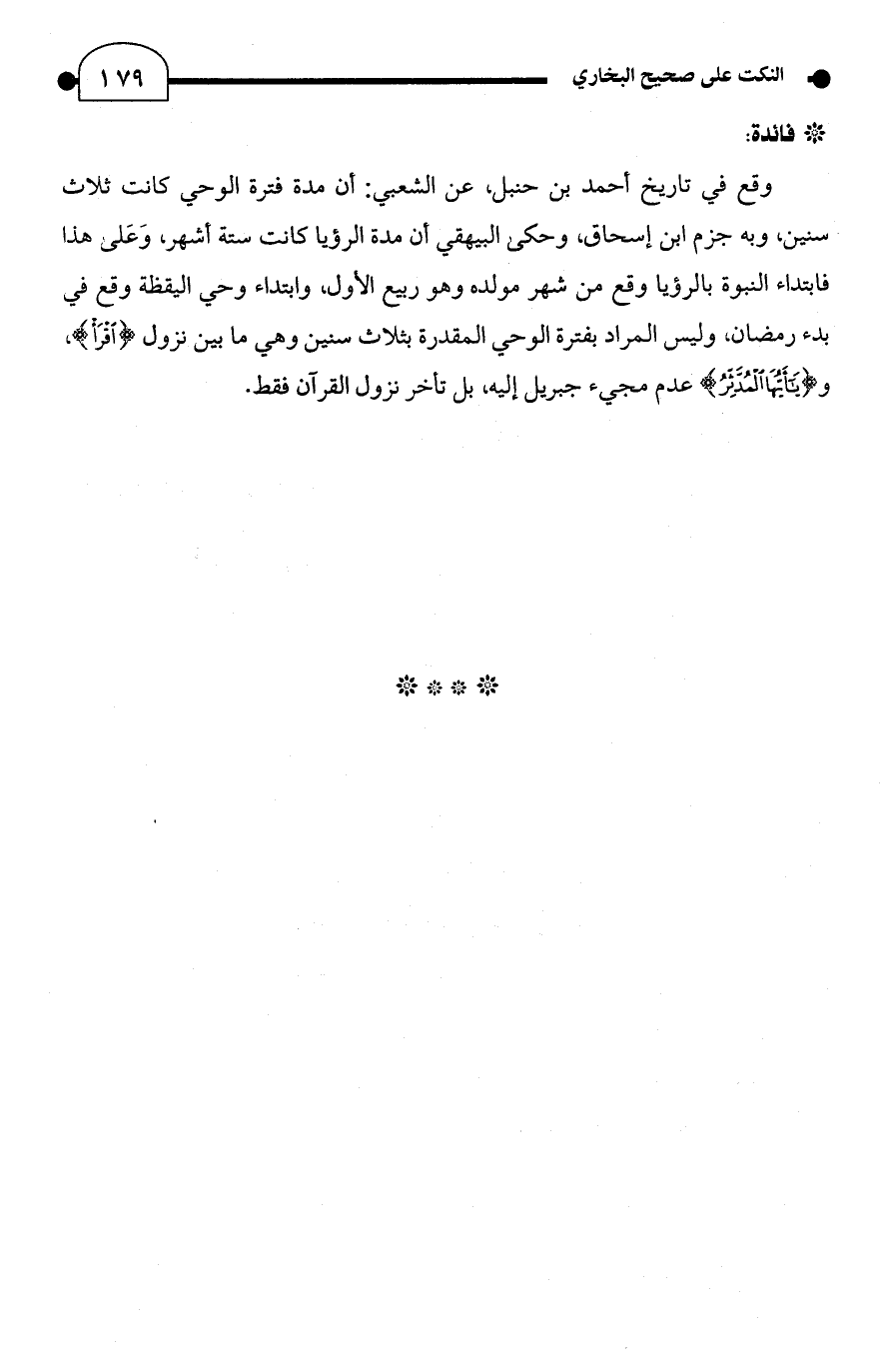 وقع في تاريخ أحمد بن حنبل، عن الشعبي: أن مدة فترة الوحي كانت ثلاث سنين، وبه جزم ابن إسحاق، وحكى البيهقي أن مدة الرؤيا كانت ستة أشهر، وَعَلى هذا فابتداء النبوة بالرؤيا وقع من شهر مولده وهو ربيع الأول، وابتداء وحي اليقظة وقع في بدء رمضان، وليس المراد بفترة الوحي المقدرة بثلاث سنين وهي ما بين نزول {اقْرَأْ}، و {يَاأَيُّهَا الْمُدَّثِّرُ} عدم مجيء جبريل إليه، بل تأخر نزول القرآن فقط.