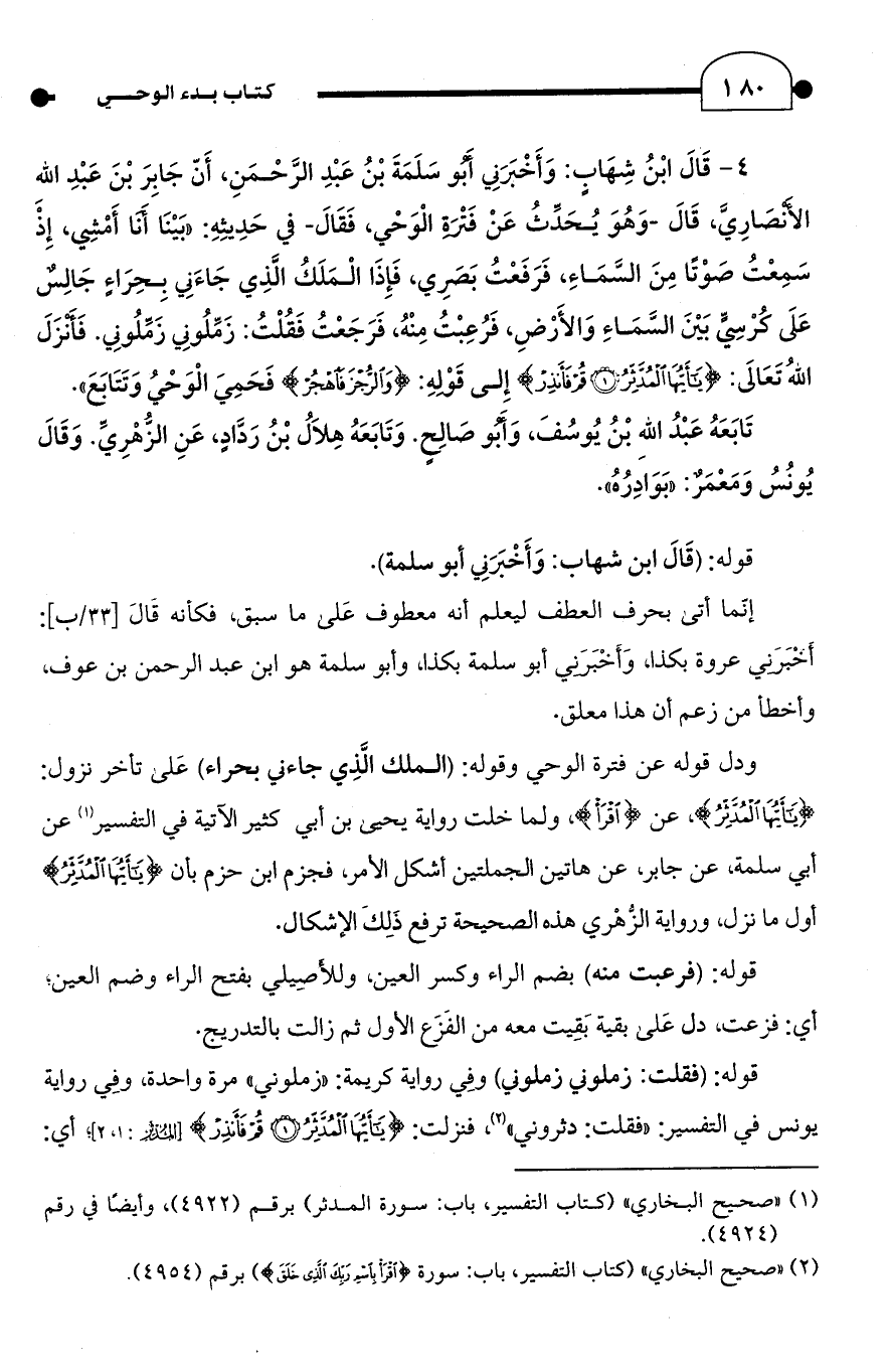 4 - قَالَ ابْنُ شِهَابٍ: وَأَخْبَرَنِي أَبُو سَلَمَةَ بْنُ عَبْدِ الرَّحْمَنِ، أَنّ جَابِرَ بْنَ عَبْدِ الله الأَنْصَارِيَّ، قَالَ -وَهُوَ يُحَدِّثُ عَنْ فَتْرَةِ الْوَحْي، فَقَالَ- في حَدِيثِهِ: "بَيْنَا أَنَا أَمْشِي، إِذْ سَمِعْتُ صَوْتًا مِنَ السَّمَاءِ، فَرَفَعْتُ بَصَرِي، فَإِذَا الْمَلَكُ الَّذِي جَاءَنِي بِحِرَاءٍ جَالِسٌ عَلَى كُرْسِيٍّ بَيْنَ السَّمَاءِ وَالأَرْضِ، فَرُعِبْتُ مِنْهُ، فَرَجَعْتُ فَقُلْتُ: زَمِّلُونِي زَمِّلُونِي. فَأَنْزَلَ اللهُ تَعَالَى: {يَاأَيُّهَا الْمُدَّثِّرُ (1) قُمْ فَأَنْذِرْ} إِلى قَوْلهِ: {وَالرُّجْزَ فَاهْجُرْ} فَحَمِيَ الْوَحْيُ وَتَتَابَعَ".