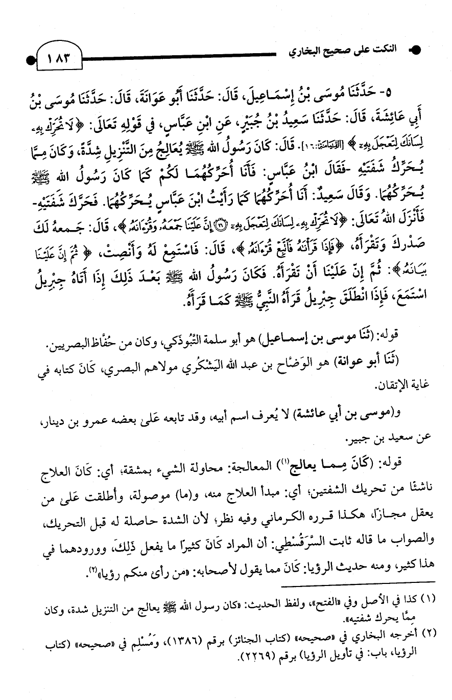 5 - حَدَّثَنَا مُوسَى بْنُ إِسْمَاعِيلَ، قَالَ: حَدَّثَنَا أَبُو عَوَانَةَ، قَالَ: حَدَّثَنَا مُوسَى بْنُ أَبِي عَائِشَةَ، قَالَ: حَدَّثَنَا سَعِيدُ بْنُ جُبَيْرٍ، عَنِ ابْنِ عَبَّاسٍ، في قَوْلِهِ تَعَالَى: {لَا تُحَرِّكْ بِهِ لِسَانَكَ لِتَعْجَلَ بِهِ} [القيامة: 16]. قَالَ: كانَ رَسُولُ الله - صلى الله عليه وسلم - يُعَالِجُ مِنَ التَّنْزِيلِ شِدَّةً، وَكان مِمَّا يُحَرِّكُ شَفَتَيْهِ -فَقَالَ ابْنُ عَبَّاس: فَأَنَا أُحَرِّكُهُمَا لَكُمْ كَمَا كَانَ رَسُولُ الله - صلى الله عليه وسلم - يُحَرِّكُهُمَا. وَقَالَ سَعِيدٌ: أَنَا أُحَرِّكُهُمَا كَمَا رَأَيْتُ ابْنَ عَبَّاسٍ يُحَرِّكُهُمَا. فَحَرَّكَ شَفَتَيْهِ- فَأَنْزَلَ اللهُ تَعَالَى: {لَا تُحَرِّكْ بِهِ لِسَانَكَ لِتَعْجَلَ بِهِ (16) إِنَّ عَلَيْنَا جَمْعَهُ وَقُرْآنَهُ}، قَالَ: جَمعهُ لَكَ صَدْركَ وَتَقْرَأَهُ، {فَإِذَا قَرَأْنَاهُ فَاتَّبِعْ قُرْآنَهُ}، قَالَ: فَاسْتَمِعْ لَهُ وَأَنْصِتْ، {ثُمَّ إِنَّ عَلَيْنَا بَيَانَهُ}: ثُمَّ إِنّ عَلَيْنَا أَنْ تَقْرَأَهُ. فَكَانَ رَسُولُ الله - صلى الله عليه وسلم - بَعْدَ ذَلِكَ إِذَا أَتَاهُ جِبْرِيلُ اسْتَمَعَ، فَإِذَا انْطَلَقَ جِبْرِيلُ قَرَأَ النَّبِيُّ - صلى الله عليه وسلم - كمَا قَرَأهُ.