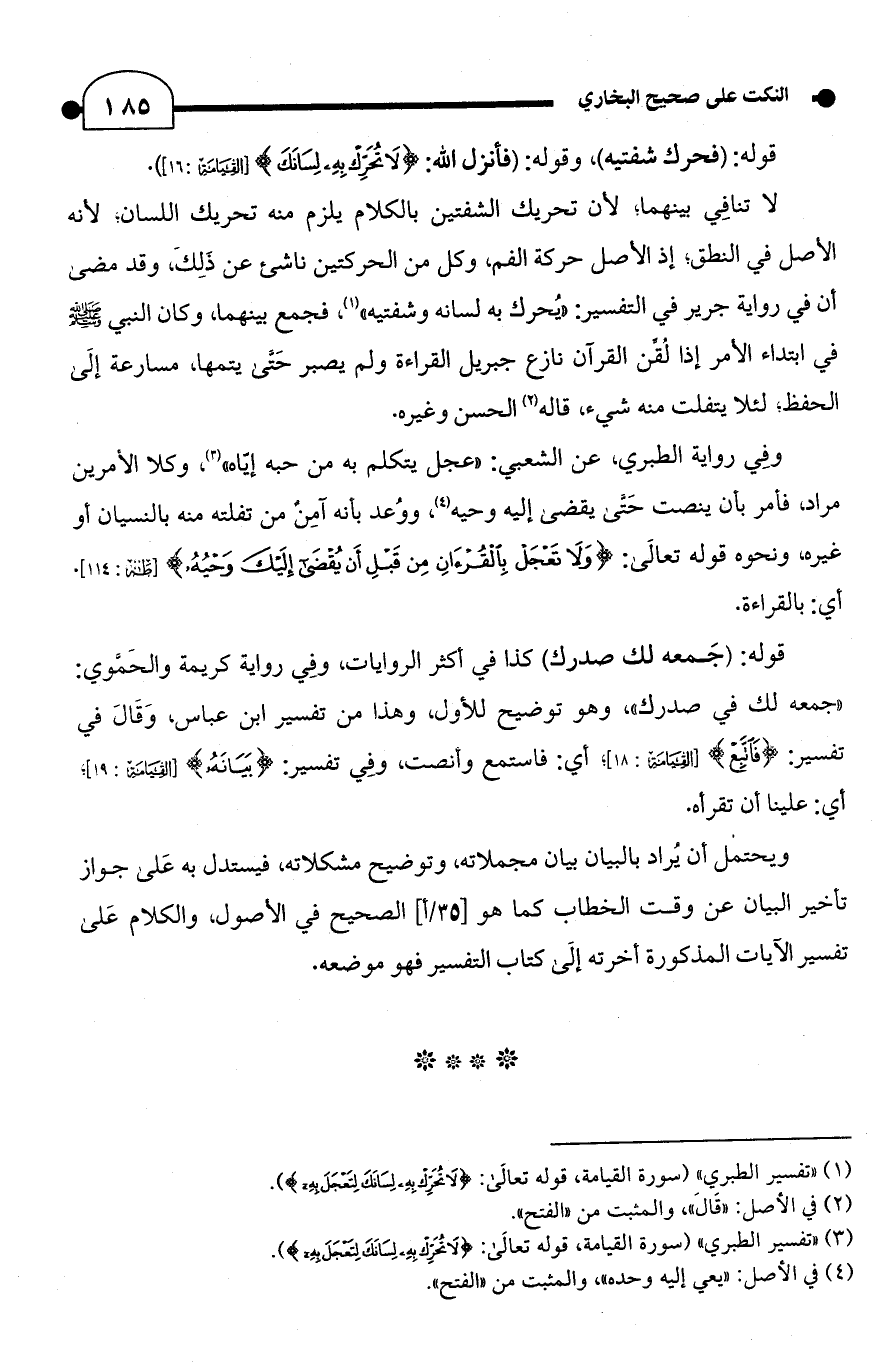 (¬1) "تفسير الطبري" (سورة القيامة، قوله تعالَى: {لَا تُحَرِّكْ بِهِ لِسَانَكَ لِتَعْجَلَ بِهِ}).