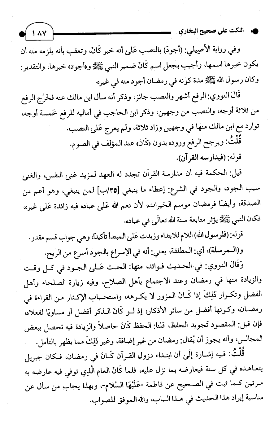 وَقَالَ النووي: في الحديث فوائد؛ منها: الحث عَلى الجود في كل وقت والزيادة منها في رمضان وعند الاجتماع بأهل الصلاح، وفيه زيارة الصلحاء وأهل الفضل وتكرار ذلِكَ إذا كَانَ المزور لا يكرهه، واستحباب الإكثار من القراءة في رمضان، وكونها أفضل من سائر الأذكار؛ إذ لو كَانَ الذكر أفضل أو مساويًا لفعلاه، فإن قيل: المقصود تَجويد الحفظ، قلنا: الحفظ كَانَ حاصلًا والزيادة فيه خصل ببعض المجالس، وأنه يجوز أن يُقال: رمضان من غير إضافة، وغير ذَلِكَ مما يظهر بالتأمل.
