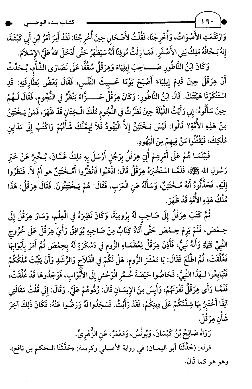 ثُمَّ كتَبَ هِرَقْلُ إِلَى صَاحِب لَهُ بِرُوميَةَ، وَكَانَ نَظِيرَهُ في الْعِلْمِ، وَسَارَ هِرَقْلُ إِلَى حِمْصَ، فَلَمْ يَرِمْ حِمْصَ حَتَّى آتَاهُ كتَابٌ مِنْ صَاحِبِهِ يُوَافِقُ رَأْيَ هِرَقْلَ عَلَى خُرُوجِ النَبِي - صلى الله عليه وسلم - وَأَنهُ نَبِيٌّ، فَأَذِنَ هِرَقْلُ لِعُظَمَاءِ الرُّومِ في دَسْكَرَةٍ لَهُ بِحِمْصَ ثُمَّ أَمَرَ بِأَبْوَابِهَا فَغُلِّقَتْ، ثُمَّ اطَّلَعَ فَقَالَ: يَا مَعْشَرَ الرُّومِ، هَلْ لَكُمْ في الْفَلَاحِ وَالرَّشَدِ وَأَنْ يَثْبُتَ مُلْكُكُمْ فَتبايِعُوا لهَذَا النَّبِيَّ، فَحَاصُوا حَيْصَةَ حُمُرِ الْوَحْشِ إِلَى الأبْوَابِ، فَوَجَدُوهَا قَدْ غُلِّقَتْ، فَلَمَّا رَأَى هِرَقْلُ نَفْرَتَهمْ، وَأَيِسَ مِنَ الإِيمَانِ قَالَ: رُدُّوهُمْ عَلَيَّ. وَقَالَ: إِنّي قُلْتُ مَقَالَتِي آنِفًا أَخْتَبِرُ بِهَا شِدَّتَكُمْ عَلَى دِينِكُمْ، فَقَدْ رَأَيْتُ. فَسَجَدُوا له وَرَضُوا عَنْهُ، فَكَانَ ذَلِكَ آخِرَ شَأْنِ هِرَقْلَ.