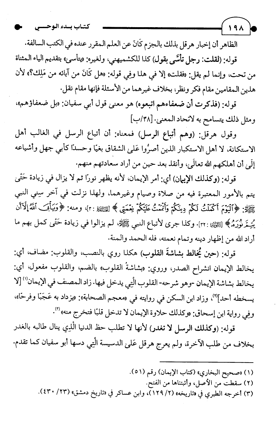 قوله: (فذكرت أن ضعفاءهم اتبعوه) هو معنى قول أبي سفيان: "بل ضعفاؤهم"، ومثل ذلك يتسامح به لاتحاد المعنى. [38/ ب]