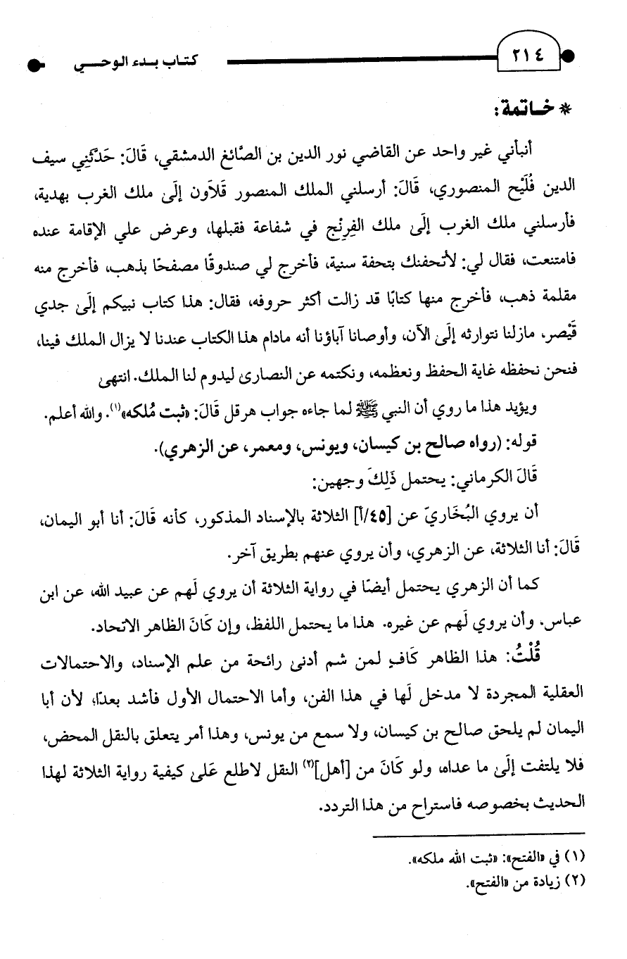 أنبأني غير واحد عن القاضي نور الدين بن الصَّائغ الدمشقي، قَالَ: حَدَّثنِي سيف الدين فُلَيْح المنصوري، قَالَ: أرسلني الملك المنصور قَلَاون إلى ملك الغرب بهدية، فأرسلني ملك الغرب إلَى ملك الفِرِنْج في شفاعة فقبلها، وعرض علي الإقامة عنده فامتنعت، فقال لي: لأتحفنك بتحفة سنية، فأخرج لي صندوقًا مصفحًا بذهب، فأخرج منه مقلمة ذهب، فأخرج منها كتابًا قد زالت أكثر حروفه، فقال: هذا كتاب نبيكم إلَى جدي قَيْصر، مازلنا نتوارثه إلَى الآن، وأوصانا آباؤنا أنه مادام هذا الكتاب عندنا لا يزال الملك فينا، فنحن نحفظه غاية الحفظ ونعظمه، ونكتمه عن النصارى ليدوم لنا الملك. انتهى