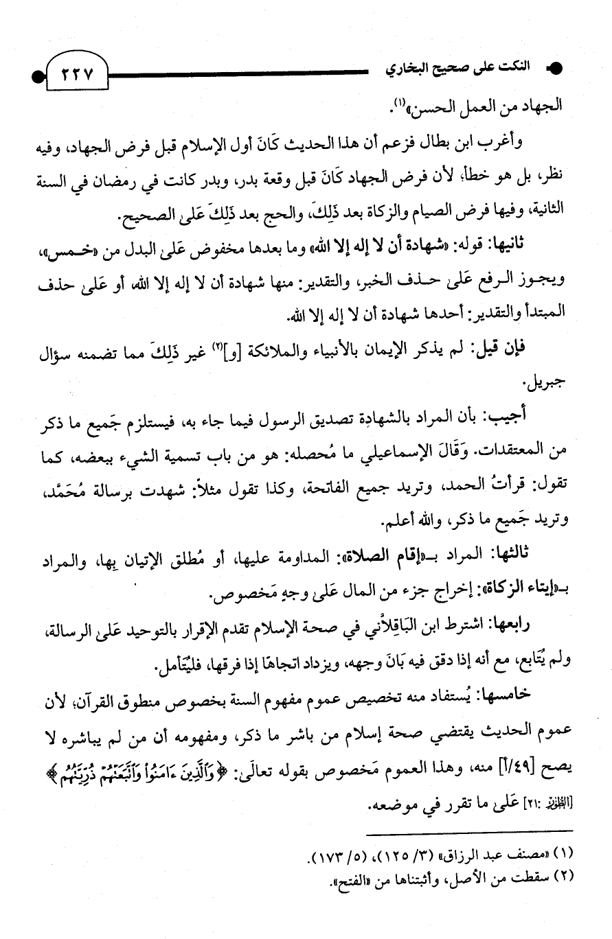 وأغرب ابن بطال فزعم أن هذا الحديث كَانَ أول الإسلام قبل فرض الجهاد، وفيه نظر، بل هو خطأ؛ لأن فرض الجهاد كَانَ قبل وقعة بدر، وبدر كانت في رمضان في السنة الثانية، وفيها فرض الصيام والزكاة بعد ذلكَ، والحج بعد ذَلِكَ عَلى الصحيح.