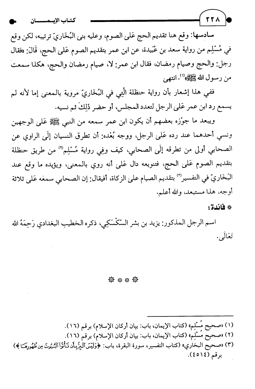 ويبعد ما جوَّزه بعضهم أن يكون ابن عمر سمعه من النبي - صلى الله عليه وسلم - عَلى الوجهين ونسي أحدهما عند رده عَلى الرجل، ووجه بُعْده: أن تطرق النسيان إلَى الراوي عن الصحابي أولى من تطرقه إلَى الصحابي، كيف وفِي رواية مُسْلِم (¬2) من طريق حنظلة بتقديم الصوم عَلى الحج، فتنويعه دال عَلى أنه روي بالمعنى، ويؤيده ما وقع عند البُخَاريّ في التفسير (¬3) بتقديم الصيام على الزكاة، أفيقال: إن الصحابي سمعه عَلى ثلاثة أوجه، هذا مستبعد، والله أعلم.