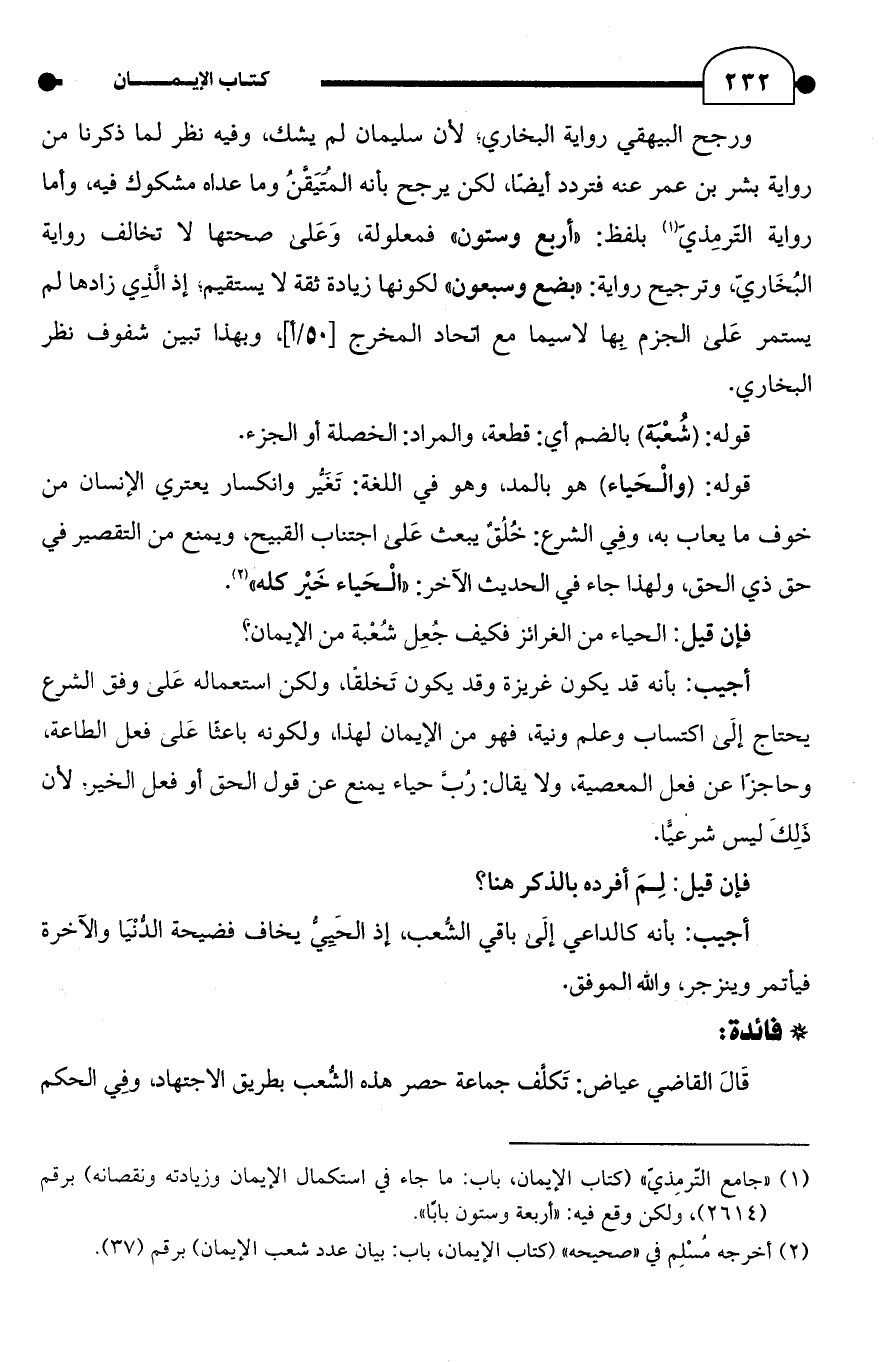 قَالَ القاضي عياض: تَكلَّف جماعة حصر هذه الشُّعب بطريق الاجتهاد، وفِي الحكم