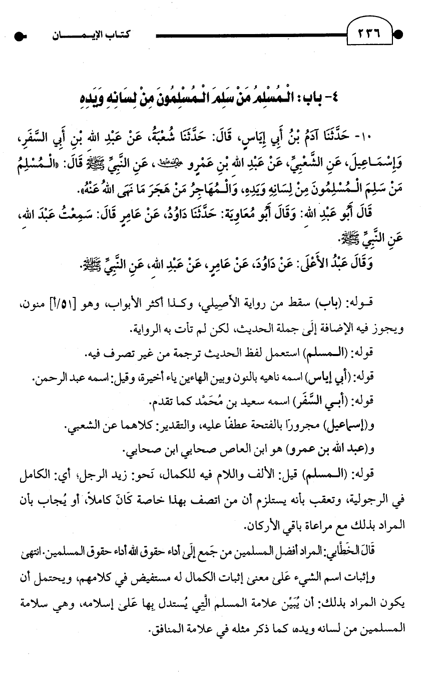 10 - حَدَّثَنَا آدَمُ بْنُ أَبِي إِيَاسٍ، قَالَ: حَدَّثَنَا شُعْبَةُ، عَنْ عَبْدِ الله بْنِ أَبِي السَّفَرِ، وَإِسْمَاعِيلَ، عَنِ الشَّعْبِيِّ، عَنْ عَبْدِ الله بْنِ عَمرٍو -رضي الله عنهما-، عَنِ النَّبِيِّ - صلى الله عليه وسلم - قَالَ: "الْمُسْلِمُ مَنْ سَلِمَ الْمُسْلِمُونَ مِنْ لِسَانِهِ وَيَدِهِ، وَالْمُهَاجِرُ مَنْ هَجَرَ مَا نَهَى اللهُ عَنْهُ".