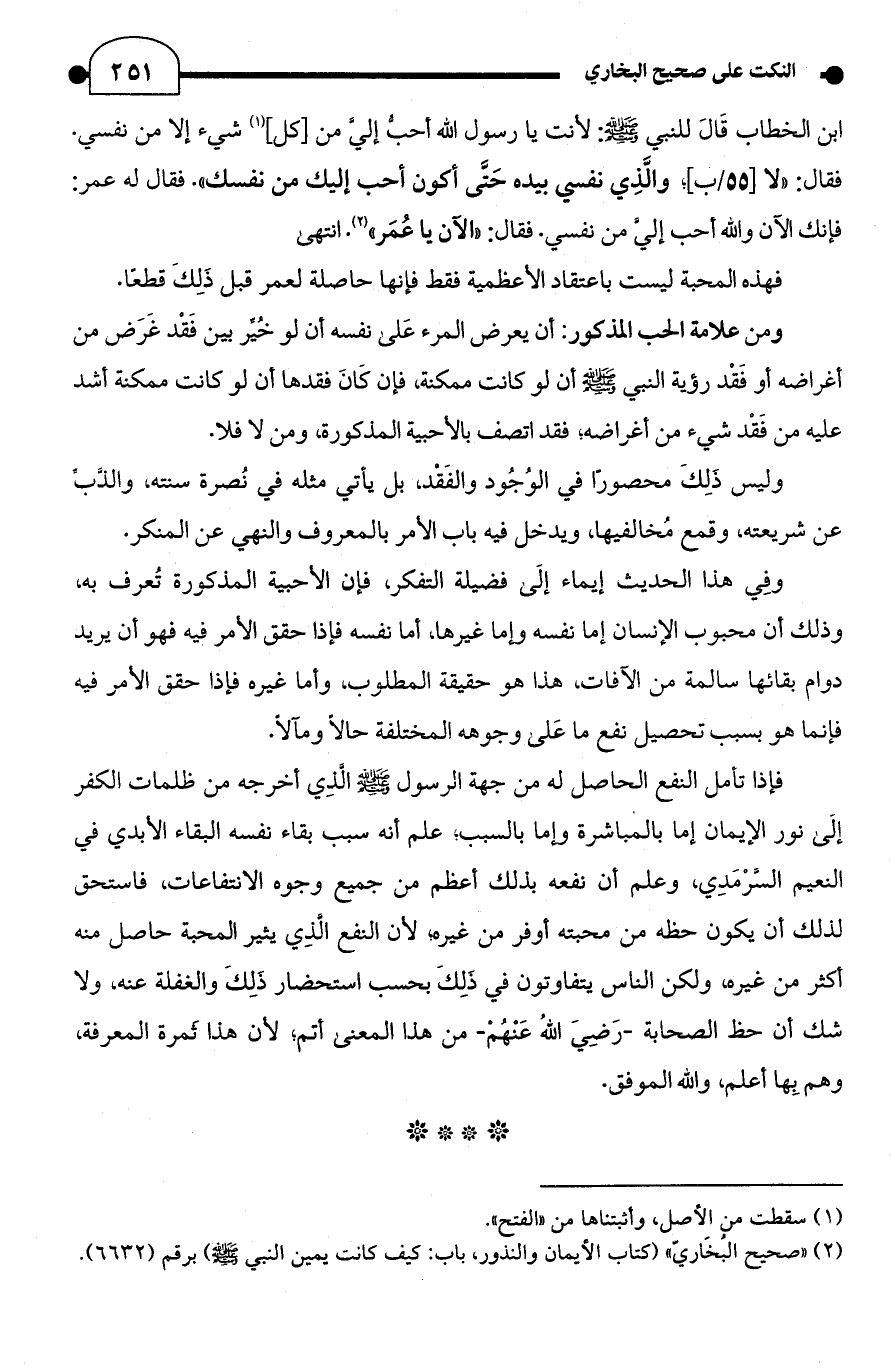 ابن الخطاب قَالَ للنبي - صلى الله عليه وسلم -: لأنت يا رسول الله أحبُّ إليَّ من [كل] (¬1) شيء إلا من نفسي. فقال: "لا [55/ ب]؛ والَّذِي نفسي بيده حَتَّى أكون أحب إليك من نفسك". فقال له عمر: فإنك الآن والله أحب إليَّ من نفسي. فقال: "الآن يا عُمَر" (¬2). انتهى