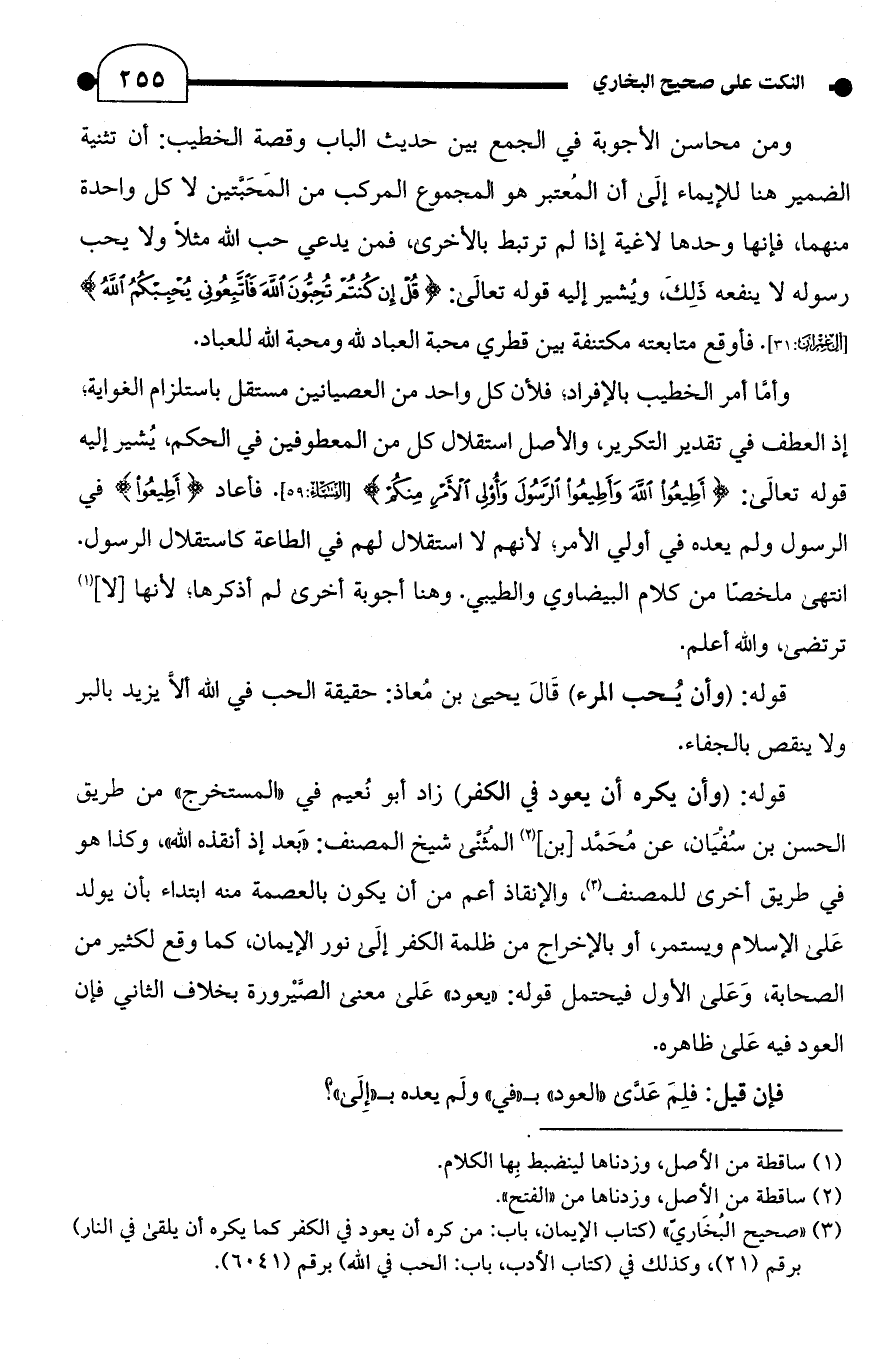 (¬3) "صحيح البُخَارِيّ" (كتاب الإيمان, باب: من كره أن يعود في الكفر كما يكره أن يلقى في النَّار) برقم (21)، وكذلك في (كتاب الأدب، باب: الحب في الله) برقم (6041).
