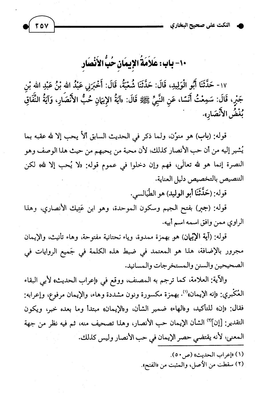 17 - حَدَّثَنَا أبو الْوَليدِ، قَالَ: حَدَّثَنَا شُعْبَةُ، قَالَ: أَخْبَرَنِي عَبْد الله بْنُ عَبْدِ الله بْنِ جَبْرٍ، قَالَ: سَمِعْتُ أنسًا، عَنِ النَّبِيِّ - صلى الله عليه وسلم - قَالَ: "آيَةُ الإِيمَانِ حُبُّ الأنصارِ، وآيَةُ النفاقِ بُغْضُ الأنصَارِ".