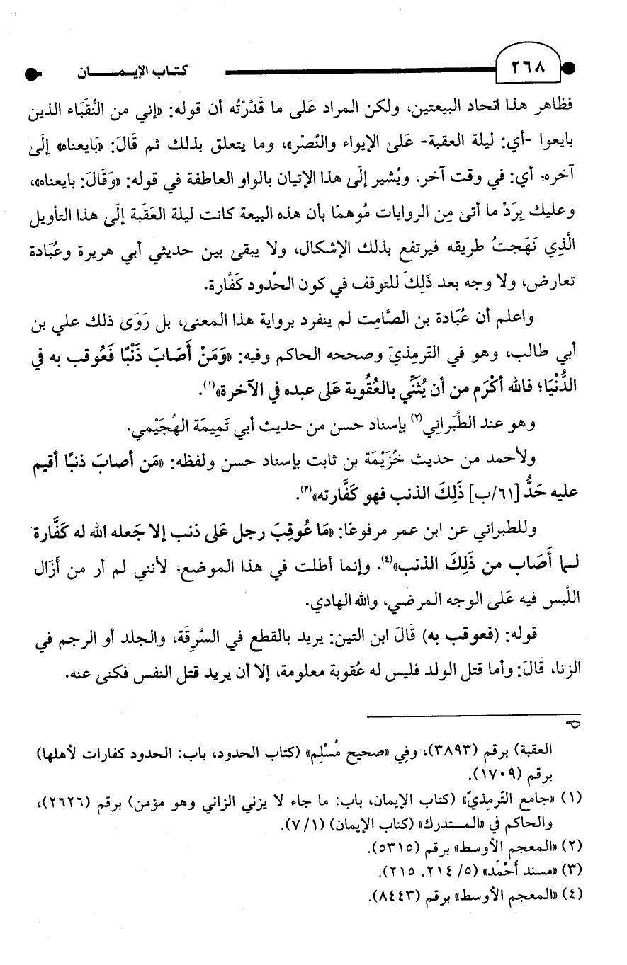 فظاهر هذا اتحاد البيعتين, ولكن المراد عَلى ما قَدَّرْتُه أن قوله: "إنِّي من النُّقَبَاء الذين بايعوا -أي: ليلة العقبة- عَلى الإيواء والنَّصْر"، وما يتعلق بذلك ثم قَالَ: "بَايعناه" إلى آخره؛ أي: في وقت آخر، ويُشير إلَى هذا الإتيان بالواو العاطفة في قوله: "وَقَالَ: بايعناه"، وعليك بِرَدِّ ما أتى مِن الروايات مُوهمًا بأن هذه البيعة كانت ليلة العَقَبة إلَى هذا التأويل الَّذِي نَهَجتُ طريقه فيرتفع بذلك الإشكال، ولا يبقى بين حديثي أبي هريرة وعُبَادة تعارض، ولا وجه بعد ذَلِكَ للتوقف في كون الحُدود كَفارة.
