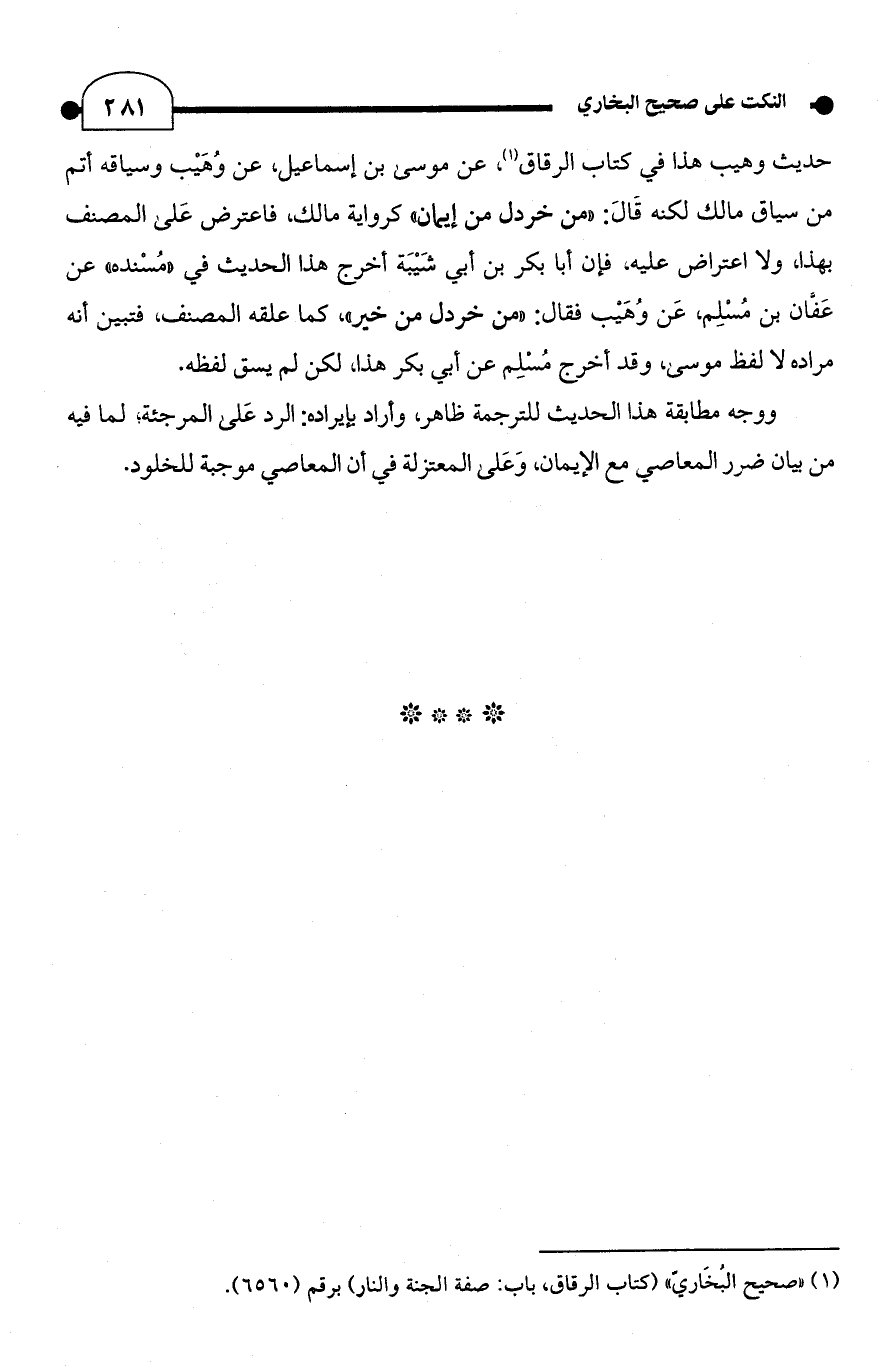 حديث وهيب هذا في كتاب الرقاق (¬1)، عن موسى بن إسماعيل، عن وُهَيْب وسياقه أتم من سياق مالك لكنه قَالَ: "من خردل من إيمان" كرواية مالك، فاعترض عَلى المصنف بهذا, ولا اعتراض عليه، فإن أَبا بكر بن أبي شَيْبَة أخرج هذا الحديث في "مُسْنده" عن عَفَّان بن مُسْلِم، عَن وُهَيْب فقال: "من خردل من خير"، كما علقه المصنف، فتبين أنَّه مراده لا لفظ موسى، وقد أخرج مُسْلِم عن أبي بكر هذا، لكن لم يسق لفظه.