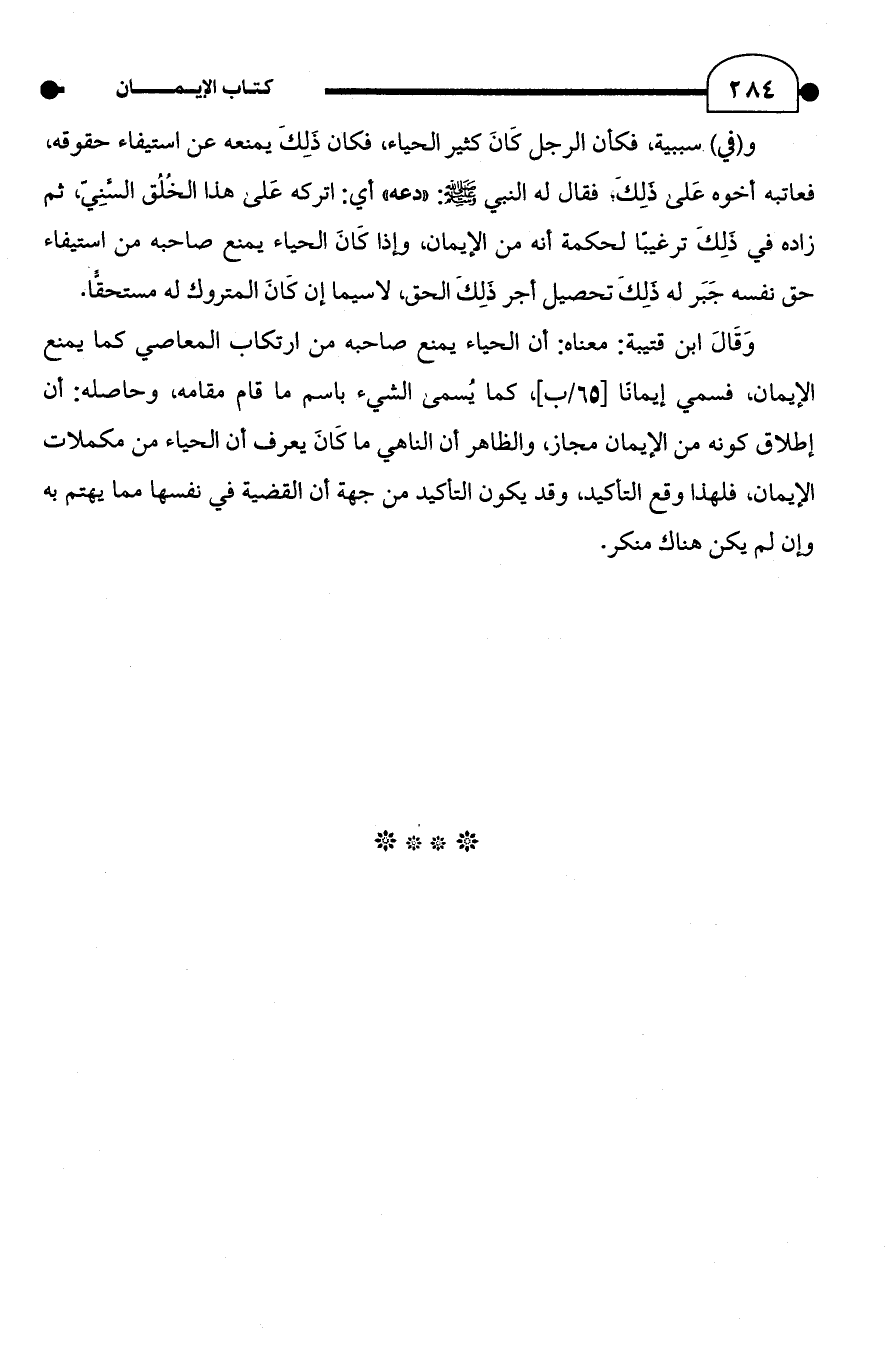 وَقَالَ ابن قتيبة: معناه: أن الحياء يمنع صاحبه من ارتكاب المعاصي كما يمنع الإيمان, فسمي إيمانًا [65/ ب]، كما يُسمى الشيء باسم ما قام مقامه، وحاصله: أن إطلاق كونه من الإيمان مجاز، والظاهر أن الناهي ما كَانَ يعرف أن الحياء من مكملات الإيمان, فلهذا وقع التأكيد، وقد يكون التأكيد من جهة أن القضية في نفسها مما يهتم به وإن لم يكن هناك منكر.