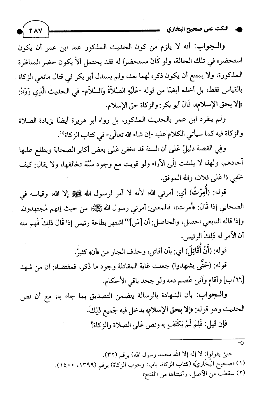 والجواب: أنَّه لا يلزم من كون الحديث المذكور عند ابن عمر أن يكون استحضره في تلك الحالة، ولو كَانَ مستحضرا له فقد يحتمل ألَّا يكون حضر المناظرة المذكورة، ولا يمتنع أن يكون ذكره لهما بعد، ولم يستدل أبو بكر في قتال مانعي الزكاة بالقياس فقط، بل أخذه أَيضًا من قوله -عَلَيْهِ الصَّلاةُ وَالسلام- في الحديث الذى رَوَاهُ: "إلَّا بحق الإِسلام"، قَالَ أبو بكر: والزكاة حق الإِسلام.