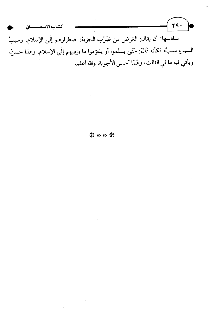 سادسها: أن يقال: الغرض من ضَرْب الجزية: اضطرارهم إلَى الإِسلام، وسببُ السببِ سبب، فكأنه قَالَ: حَتَّى يسلموا أو يلتزموا ما يؤديهم إلى الإِسلام، وهذا حسنٌ، ويأتي فيه ما في الثالث، وهُمَا أحسن الأجوبة، والله أعلم.