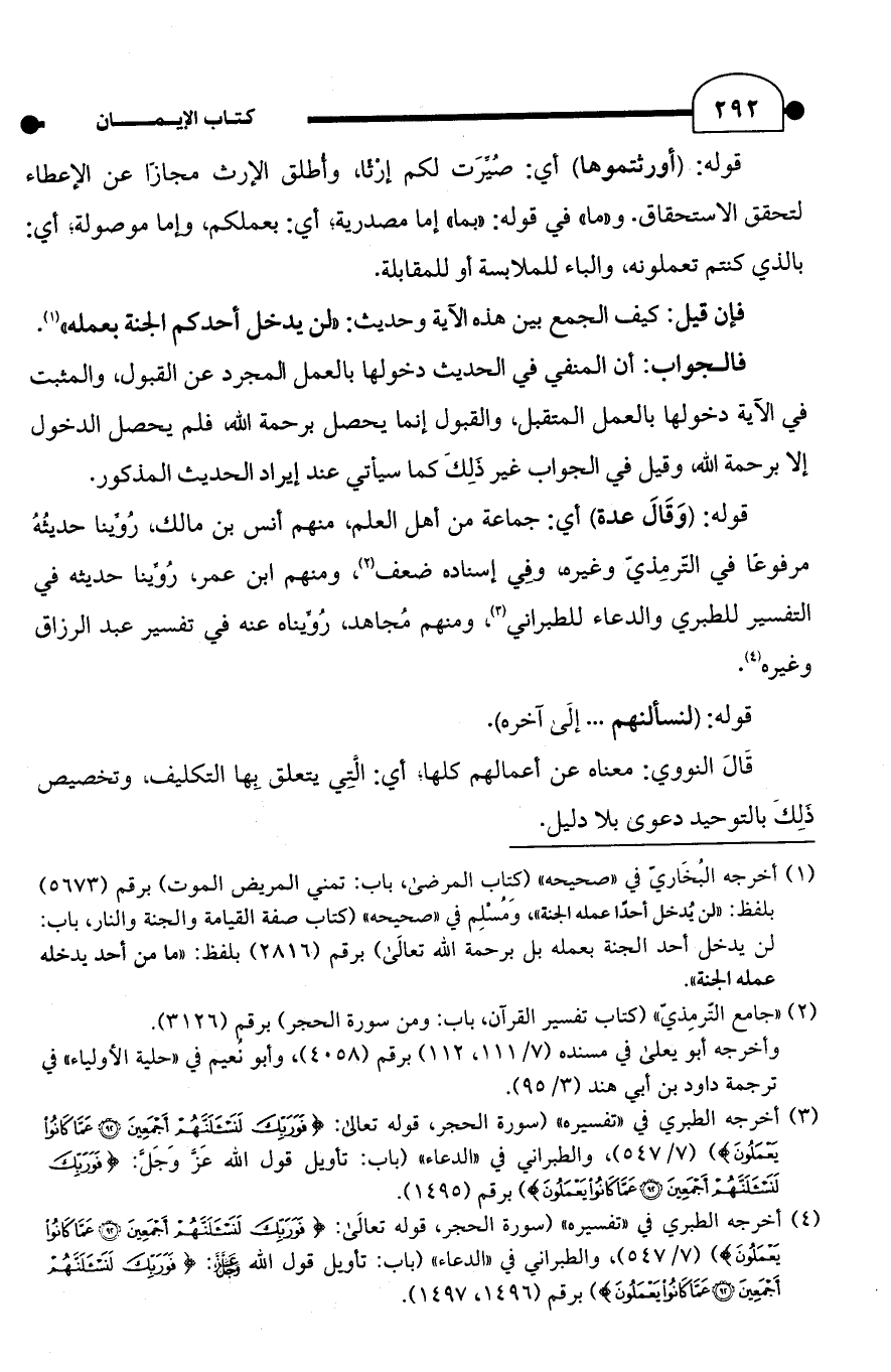 (¬4) أخرجه الطبري في "تفسيره" (سورة الحجر، قوله تعالَى: {فَوَرَبِّكَ لَنَسْأَلَنَّهُمْ أَجْمَعِينَ (92) عَمَّا كَانُوا يَعْمَلُونَ}) (7/ 547)، والطبراني في "الدعاء" (باب: تأويل قول الله -عز وجل-: {فَوَرَبِّكَ لَنَسْأَلَنَّهُمْ أَجْمَعِينَ (92) عَمَّا كَانُوا يَعْمَلُونَ}) برقم (1496، 1497).