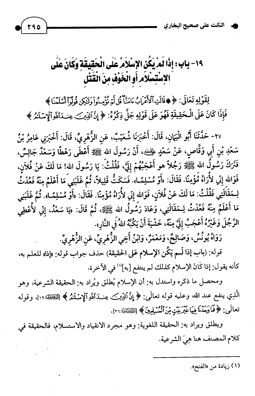 27 - حَدَّثَنَا أبو الْيَمانِ، قَالَ: أَخْبَرَنَا شُعَيْب، عَنِ الزُّهْرِيِّ، قَالَ: أَخْبَرَنِي عَامِرُ بْنُ سَعْدِ بْنِ أَبِي وَقَّاص، عَنْ سَعْدٍ - رضي الله عنه -، أَن رَسُولَ اللهِ - صلى الله عليه وسلم - أَعْطَى رَهْطًا وَسَعْدٌ جَالِسٌ، فَتَرَكَ رَسُولُ اللهِ - صلى الله عليه وسلم - رَجُلًا هو أَعْجَبُهُم إِليَّ، فَقُلْتُ: يَا رَسُولَ اللهِ! مَا لَكَ عَن فُلان، فَوَالله إِنّي لأُرَاهُ مُؤْمِنا. فَقَالَ: "أَوْ مُسْلِمًا". فَسَكَتُّ قَلِيلًا، ثُمَّ غَلَبَني مَا أَعْلَمُ مِنْهُ فَعُدْتُ لِمَقالَتِي فَقُلْتُ: مَا لَكَ عَنْ فُلان، فَوَاللهِ إِنّي لأُرَاهُ مُؤْمِنًا. فَقَالَ: "أَوْ مُسْلِمًا". ثُمَّ غَلَبَني مَا أَعْلَمُ مِنْهُ فَعُدْتُ لِمَقَالَتي، وَعَادَ رَسُولُ اللهِ - صلى الله عليه وسلم -، ثُمَّ قَالَ: "يَا سَعْدُ، إِني لأُعْطِي الرَّجُلَ وَغَيْرُهُ أَعْجَبُ إِليَّ مِنْهُ، خَشْيَةَ أَنْ يَكُبَّهُ اللهُ فَي النَّارِ".