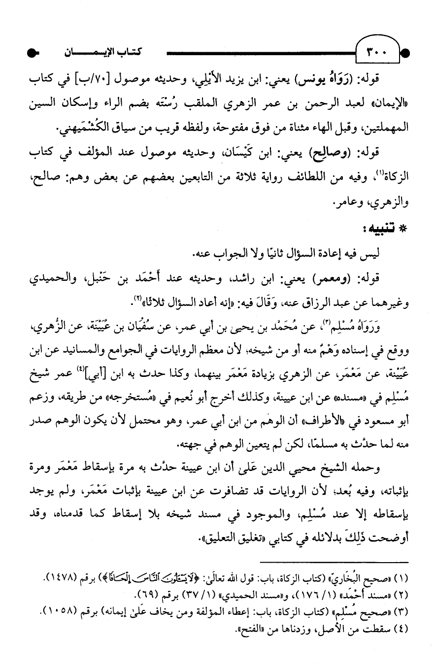 وحمله الشيخ محيي الدين عَلى أن ابن عيينة حدَّث به مرة بإسقاط مَعْمَر ومرة بإثباته، وفيه بُعد؛ لأن الروايات قد تضافرت عن ابن عيينة بإثبات مَعْمَر، ولم يوجد بإسقاطه إلَّا عند مُسْلِم، والموجود في مسند شيخه بلا إسقاط كما قدمناه، وقد أوضحت ذلِكَ بدلائله في كتابي "تغليق التعليق".