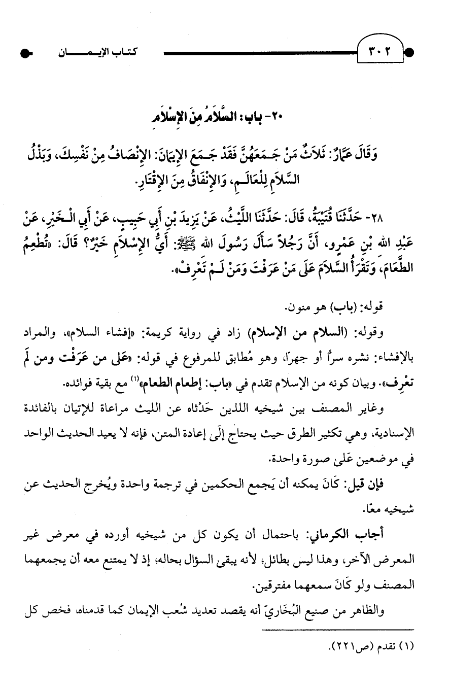 28 - حَدَّثَنَا قُتَيْبَةُ, قَالَ: حَدَّثَنَا اللَّيْثُ, عَنْ يَزِيدَ بْنِ أَبِي حَبِيبٍ, عَنْ أَبِي الْخَيْرِ, عَنْ عَبْدِ اللَّهِ بْنِ عَمْرٍو, أَنَّ رَجُلًا سَأَلَ رَسُولَ اللَّهِ - صلى الله عليه وسلم -: أَيُّ الإِسْلَامِ خَيْرٌ؟ قَالَ: "تُطْعِمُ الطَّعَامَ، وَتَقْرَأُ السَّلَامَ عَلَى مَنْ عَرَفْتَ وَمَنْ لَمْ تَعْرِفْ".