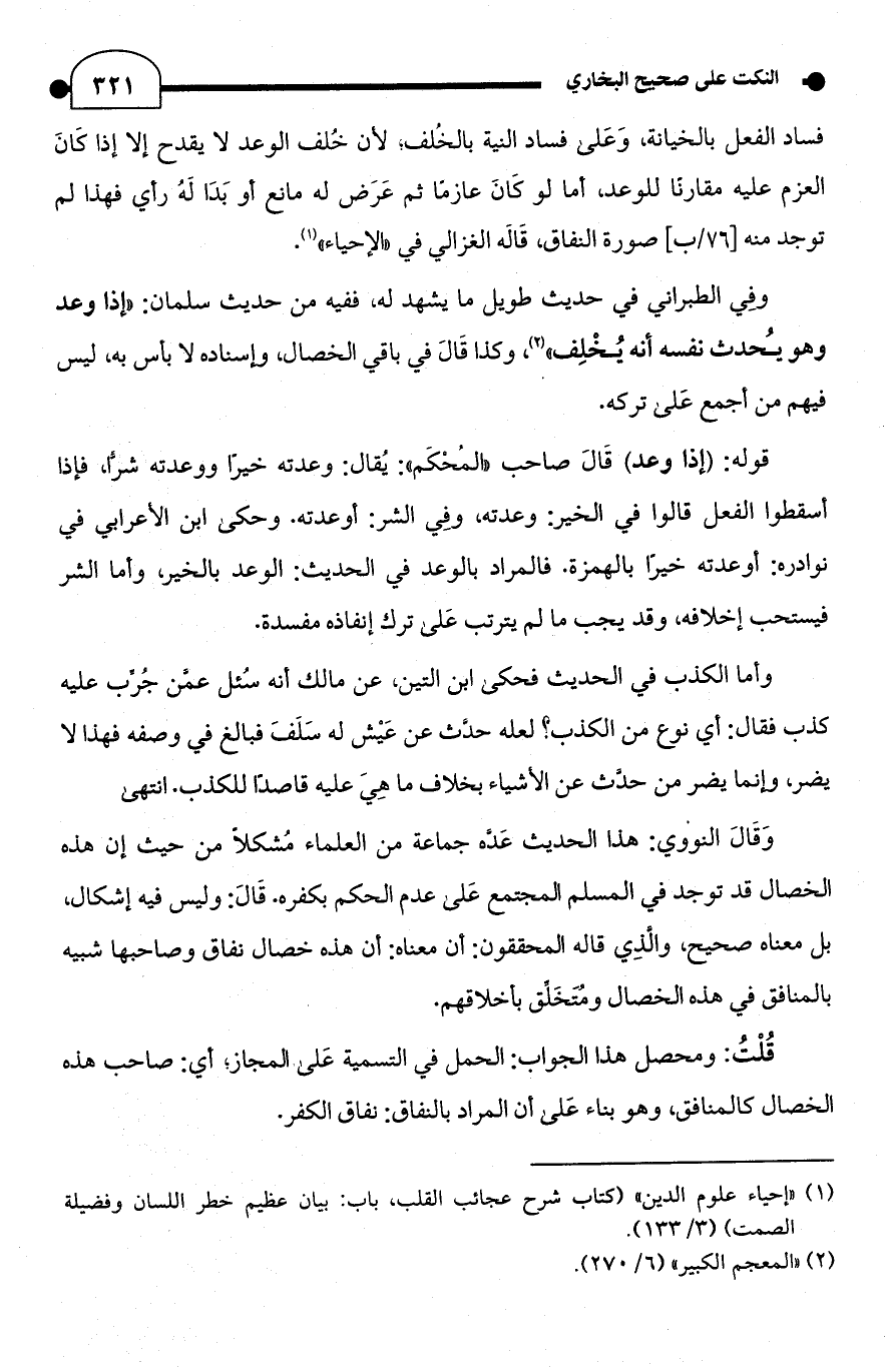 فساد الفعل بالخيانة، وَعَلى فساد النية بالخُلف؛ لأن خُلف الوعد لا يقدح إلا إذا كَانَ العزم عليه مقارنًا للوعد، أما لو كَانَ عازمًا ثم عَرَض له مانع أو بَدَا لَهُ رأي فهذا لم توجد منه [76 / ب] صورة النفاق، قَالَه الغزالي في "الإحياء" (¬1).