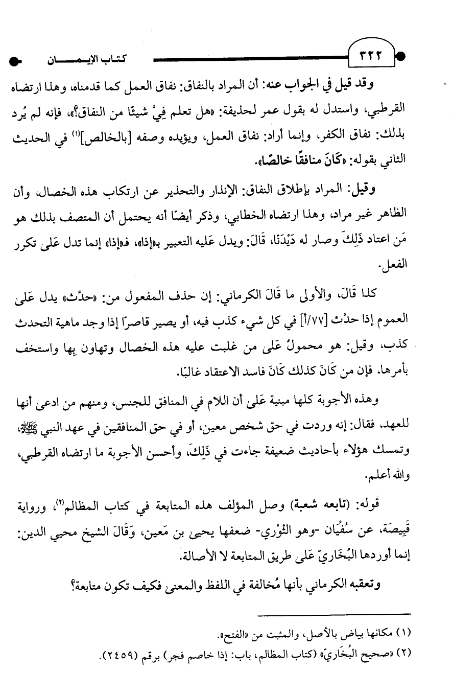 وهذه الأجوبة كلها مبنية عَلى أن اللام في المنافق للجنس، ومنهم من ادعى أنها للعهد, فقال: إنه وردت في حق شخص معين، أو في حق المنافقين في عهد النبي - صلى الله عليه وسلم -، وتمسك هؤلاء بأحاديث ضعيفة جاءت في ذَلكَ، وأحسن الأجوبة ما ارتضاه القرطبي، والله أعلم.