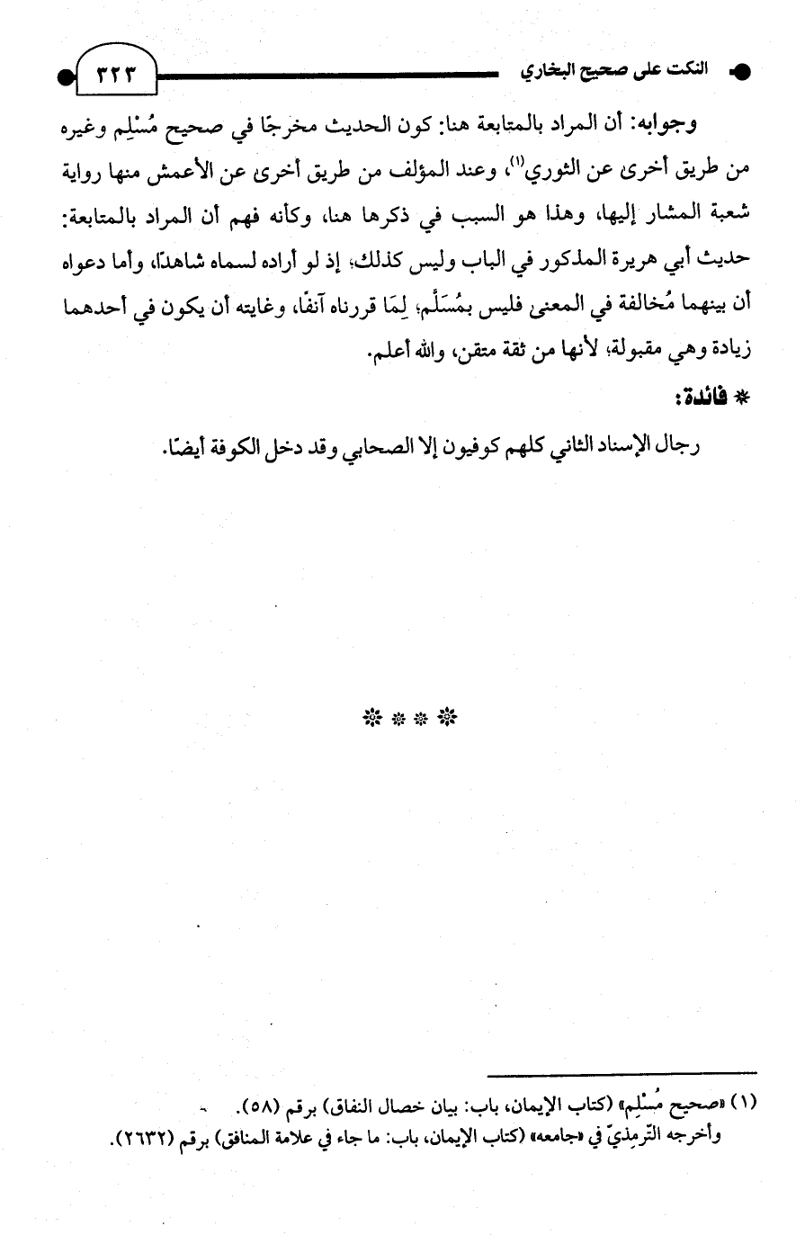 وجوابه: أن المراد بالمتابعة هنا: كون الحديث مخرجًا في صحيح مُسْلِم وغيره من طريق أخرى عن الثوري (¬1)، وعند المؤلف من طريق أخرى عن الأعمش منها رواية شعبة المشار إليها، وهذا هو السبب في ذكرها هنا، وكأنه فهم أن المراد بالمتابعة: حديث أبي هريرة المذكور في الباب وليس كذلك؛ إذ لو أراده لسماه شاهدًا، وأما دعواه أن بينهما مُخالفة في المعنى فليس بمُسَلَّم؛ لِمَا قررناه آنفًا، وغايته أن يكون في أحدهما زيادة وهي مقبولة؛ لأنها من ثقة متقن، والله أعلم.