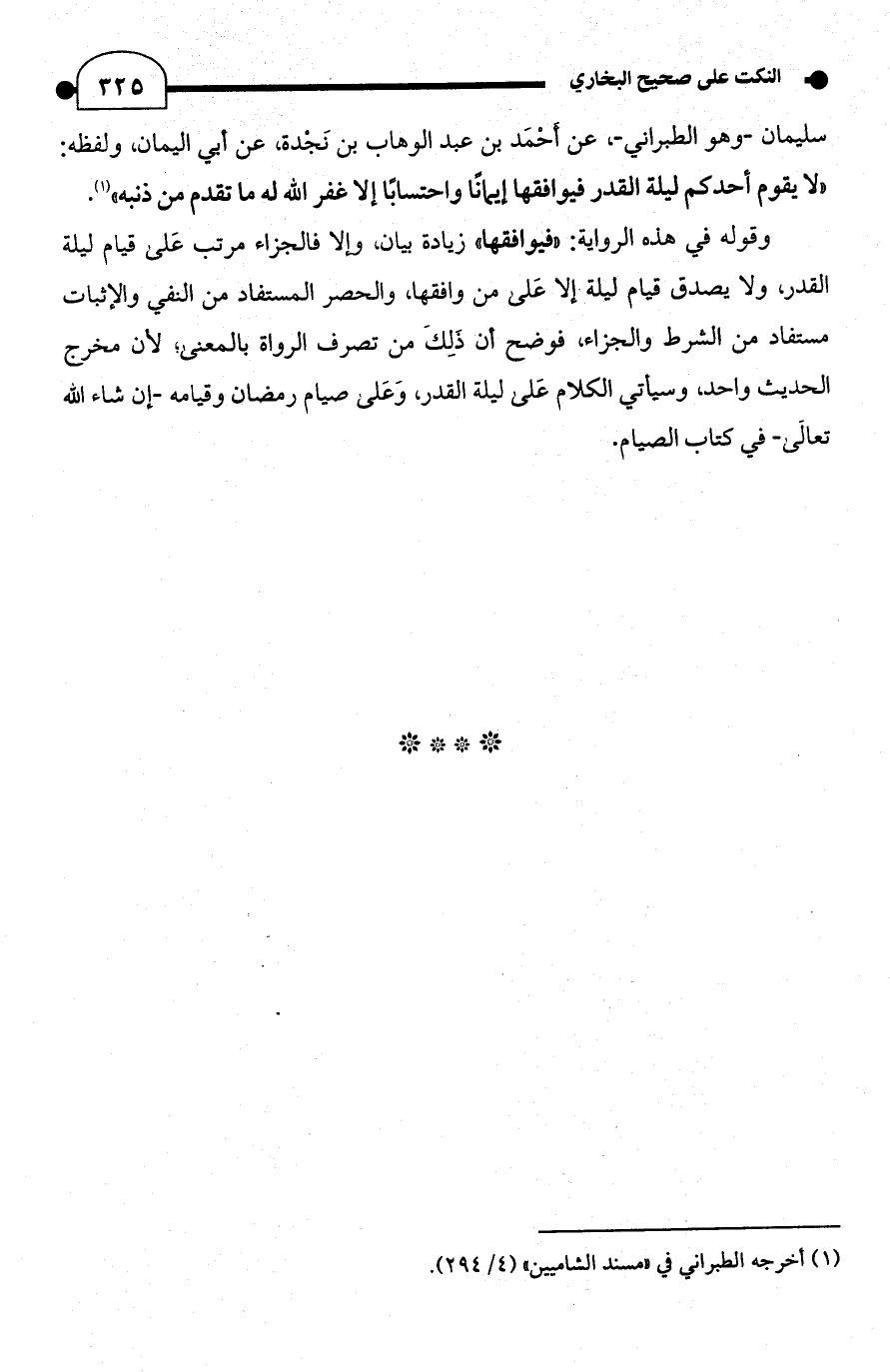 سليمان -وهو الطبراني-، عن أحْمَد بن عبد الوهاب بن نَجْدة، عن أبي اليمان، ولفظه: "لا يقوم أحدكم ليلة القدر فيوافقها إيمانًا واحتسابًا إلا غفر الله له ما تقدم من ذنبه" (¬1).